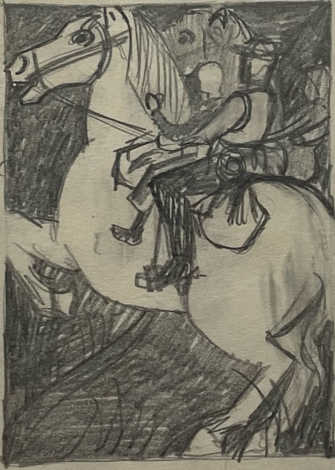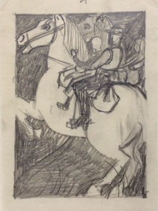 Preliminary and composite sketch for "Biography of Abraham Lincoln in Woodcuts". Man and child on horseback with horse rearing up.Collection
