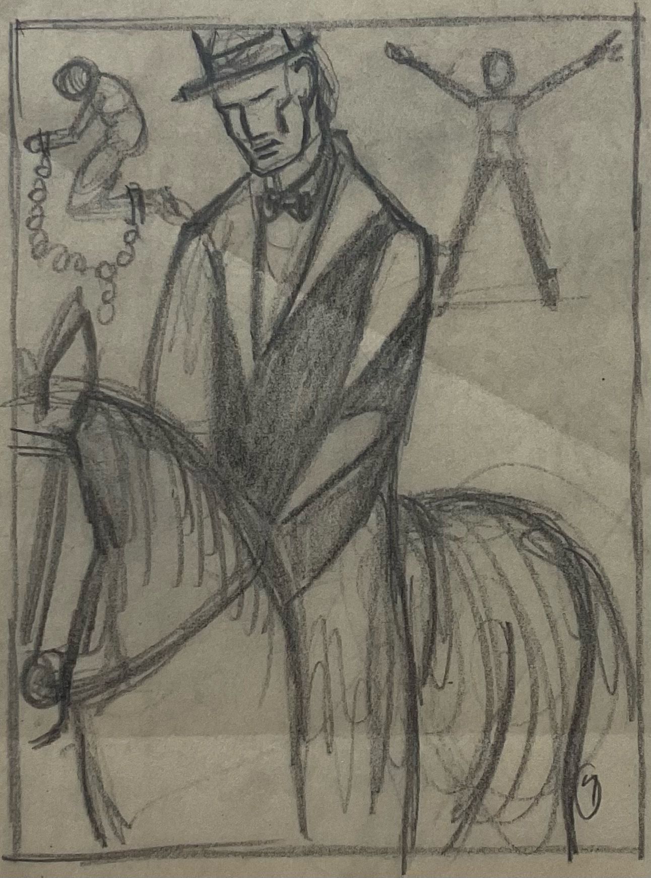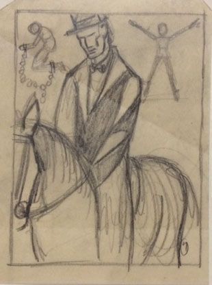 Preliminary and composite sketch for "Biography of Abraham Lincoln in Woodcuts". Lincoln sitting on horse looking down in foreground, background drawing of man in chains and man outstretched.Collection