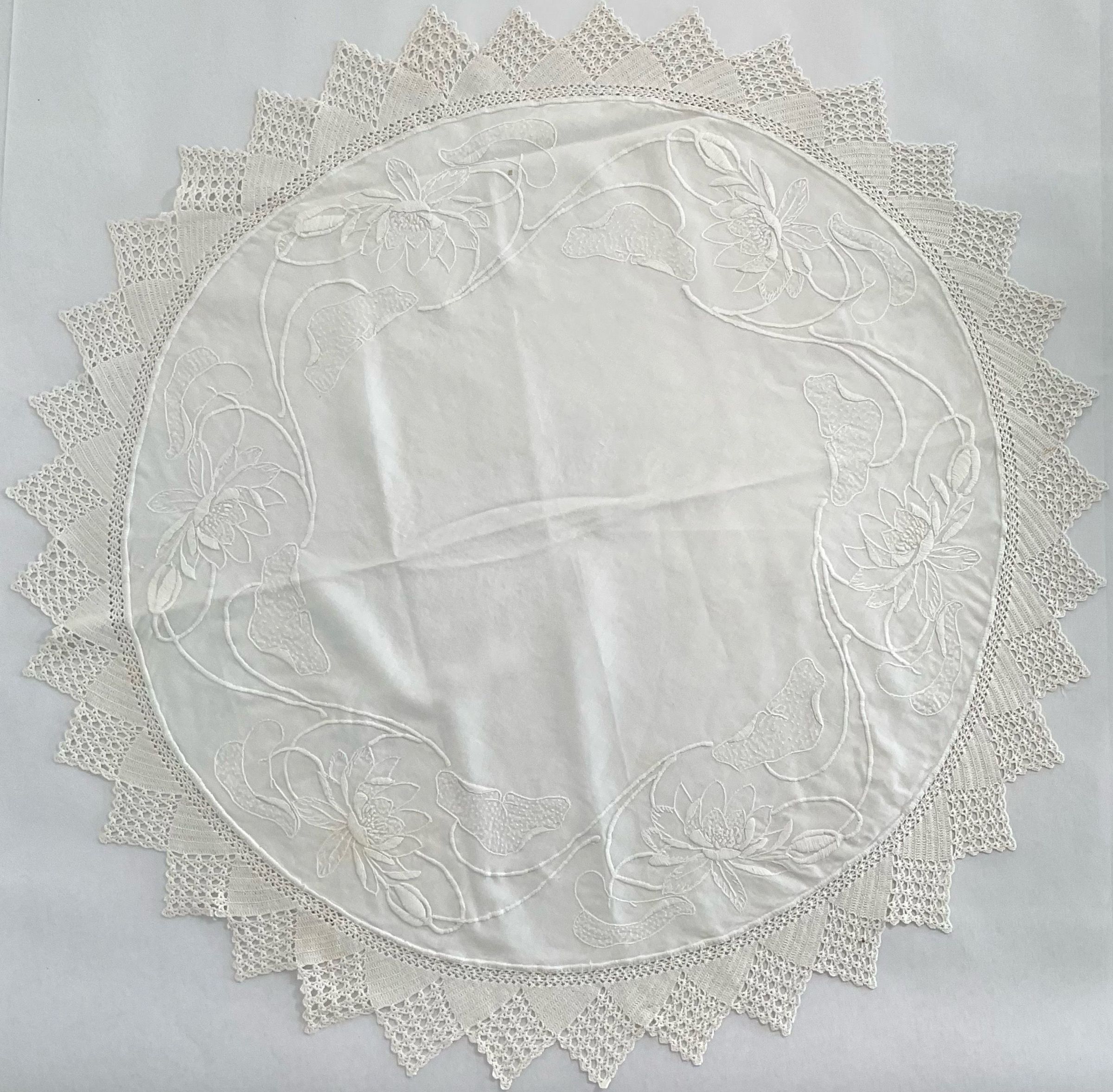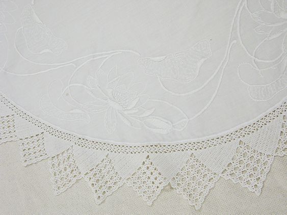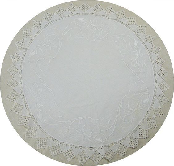White cotton table cover with white on white embroidery and white crocheted (imitation quipere) lace edge.quipere) lace edge. Linen circle is 27-1/2" in diameter- and crocheted decorative edge is between 3-1/2" and 2" in width.Collection