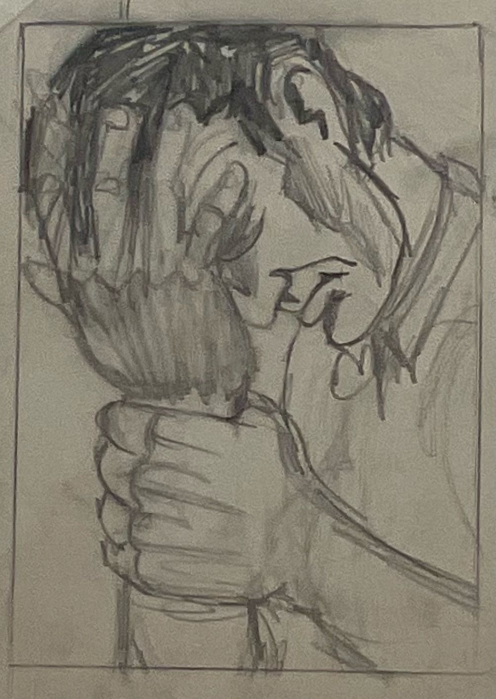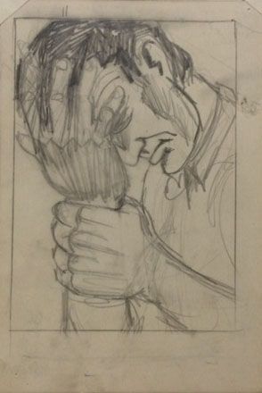 Preliminary and composite sketch for "Biography of Abraham Lincoln in Woodcuts". We see a side view of Lincoln bent over his left hand on his forehead his right hand grasping his left wrist. Printed in the United States at Chicago 1933 during 'A Century of Progress Exposition'"Collection