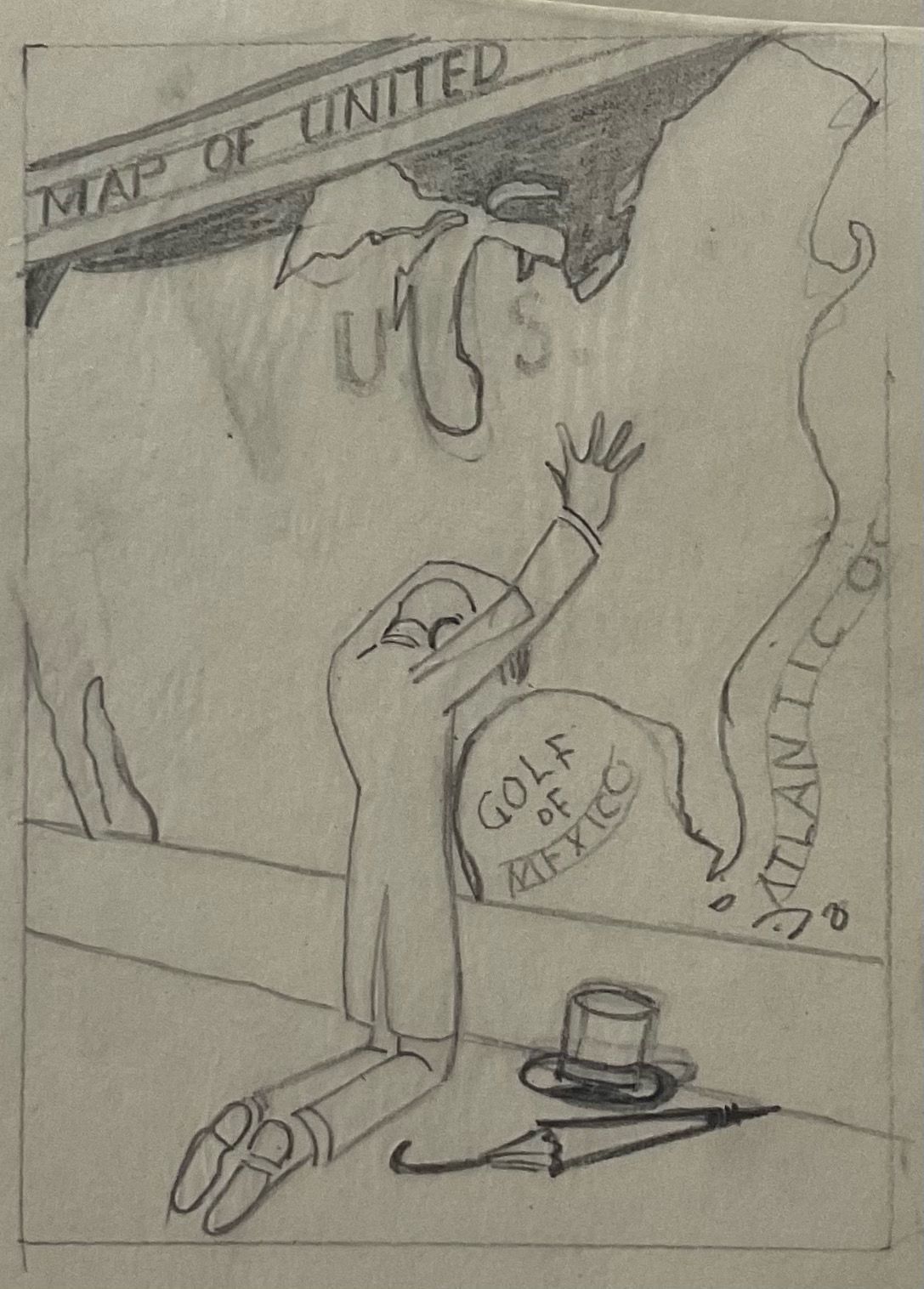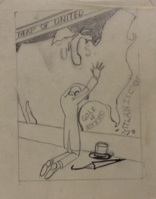 Preliminary and composite sketch for "Biography of Abraham Lincoln in Woodcuts". Lincoln kneels in front of a map of the United states his head in his left arm his right arm on the map. His hat and umbrella are on the floor beside him to his right. Printed in the United States at Chicago 1933 during 'A Century of Progress Exposition'Collection