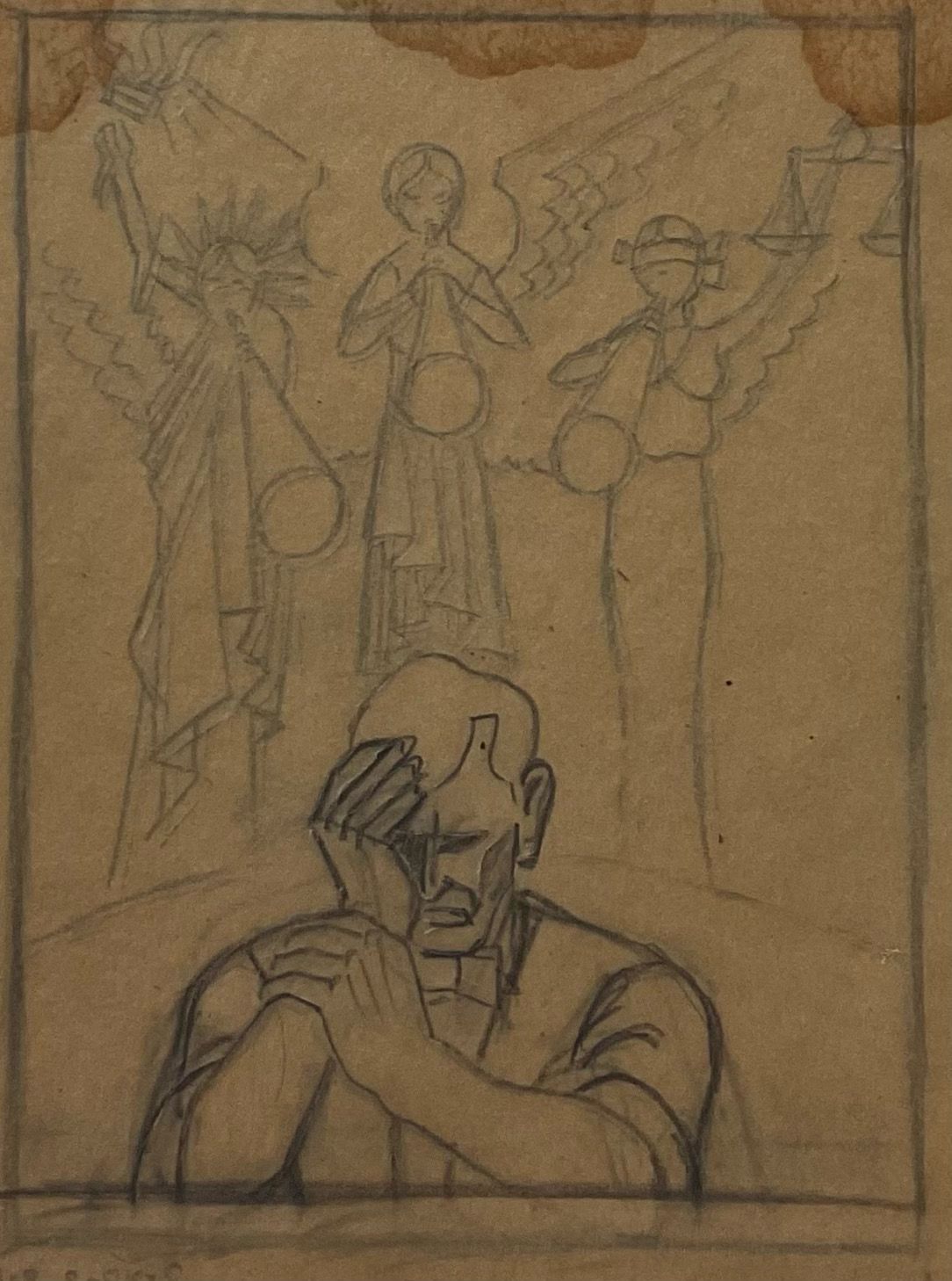 Preliminary and composite sketch for "Biography of Abraham Lincoln in Woodcuts". Lincoln faces viewer his head in his palm while representations of Justice liberty and faith trumpet in the background. Printed in the United States at Chicago 1933 during 'A Century of Progress Exposition'"Collection