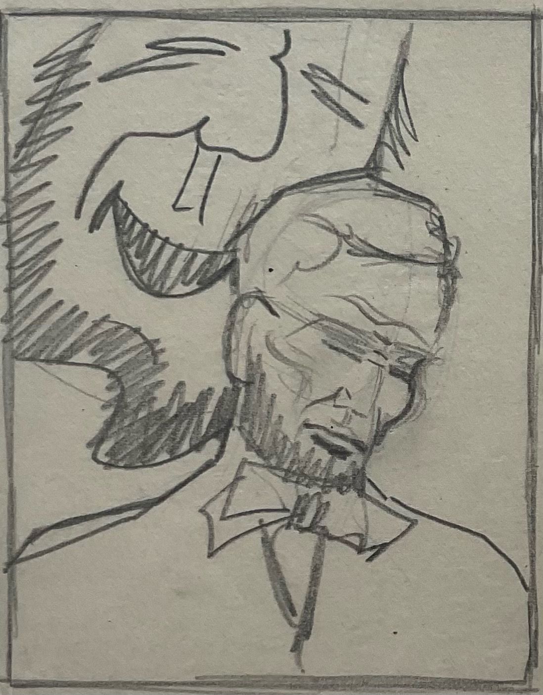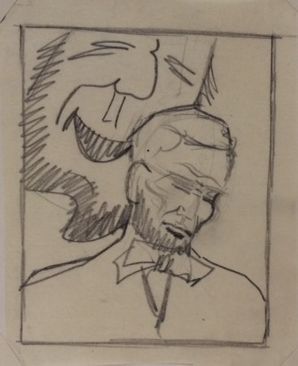 Preliminary and composite sketch for "Biography of Abraham Lincoln in Woodcuts" . Abe looks down in the lower right corner image of face superimposed above him in the background there is a men laughing. Printed in the United States at Chicago 1933 during 'A Century of Progress Exposition'"Collection