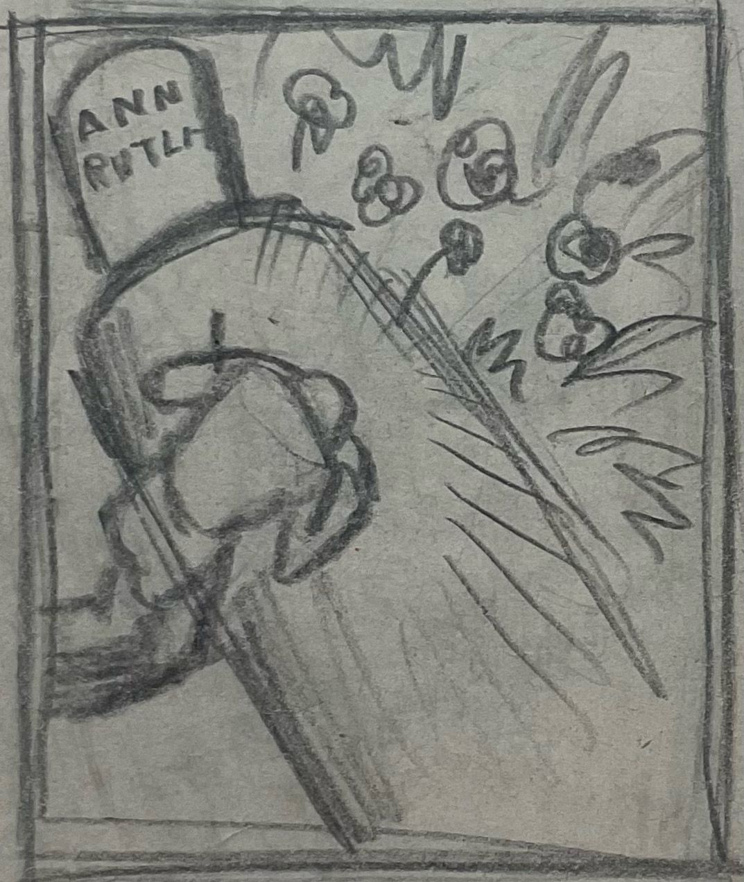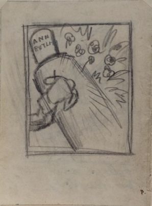 Preliminary rough and composite sketch for "Biography of Abraham Lincoln in Woodcuts". A figure lies over a grave holding flowers, the tombstone reads Ann Rutledge. There are abstracted plants/flowers in the background. Printed in the United States at Chicago 1933 during 'A Century of Progress Exposition'"Collection