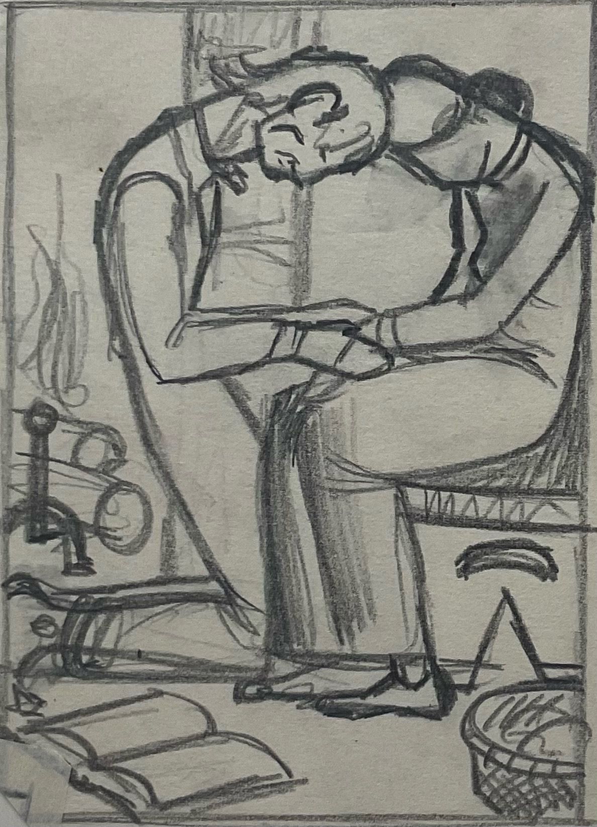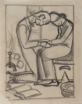 Preliminary and composite sketch for "Biography of Abraham Lincoln in Woodcuts". Two figures, a man and a woman, the man is on his knees while the woman is seated. He is clasping the woman's hands. Printed in the United States at Chicago 1933 during 'A Century of Progress Exposition'"Collection