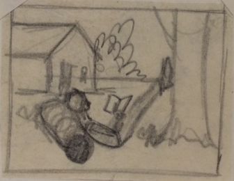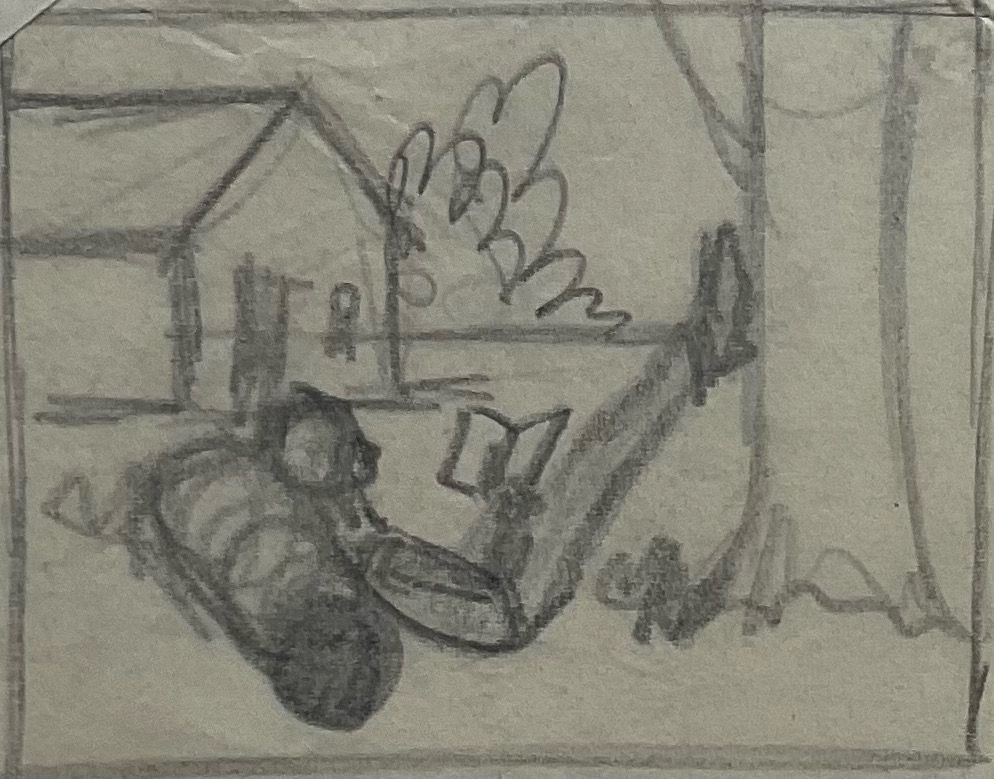 Preliminary and composite sketch for "Biography of Abraham Lincoln in Woodcuts". In the foreground a figure is reclining in the shade against a log feet propped against a tree reading a book.. In the background there is a building. printed in black ink Initialed CT in the lower right corner letters are turned around backwards1933 by Charles Turzak" Printed in the United States at Chicago 1933 during 'A Century of Progress Exposition'"Collection