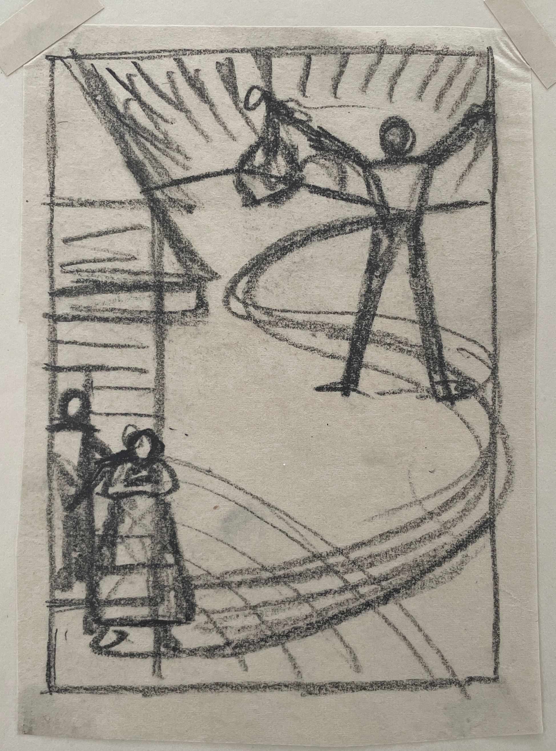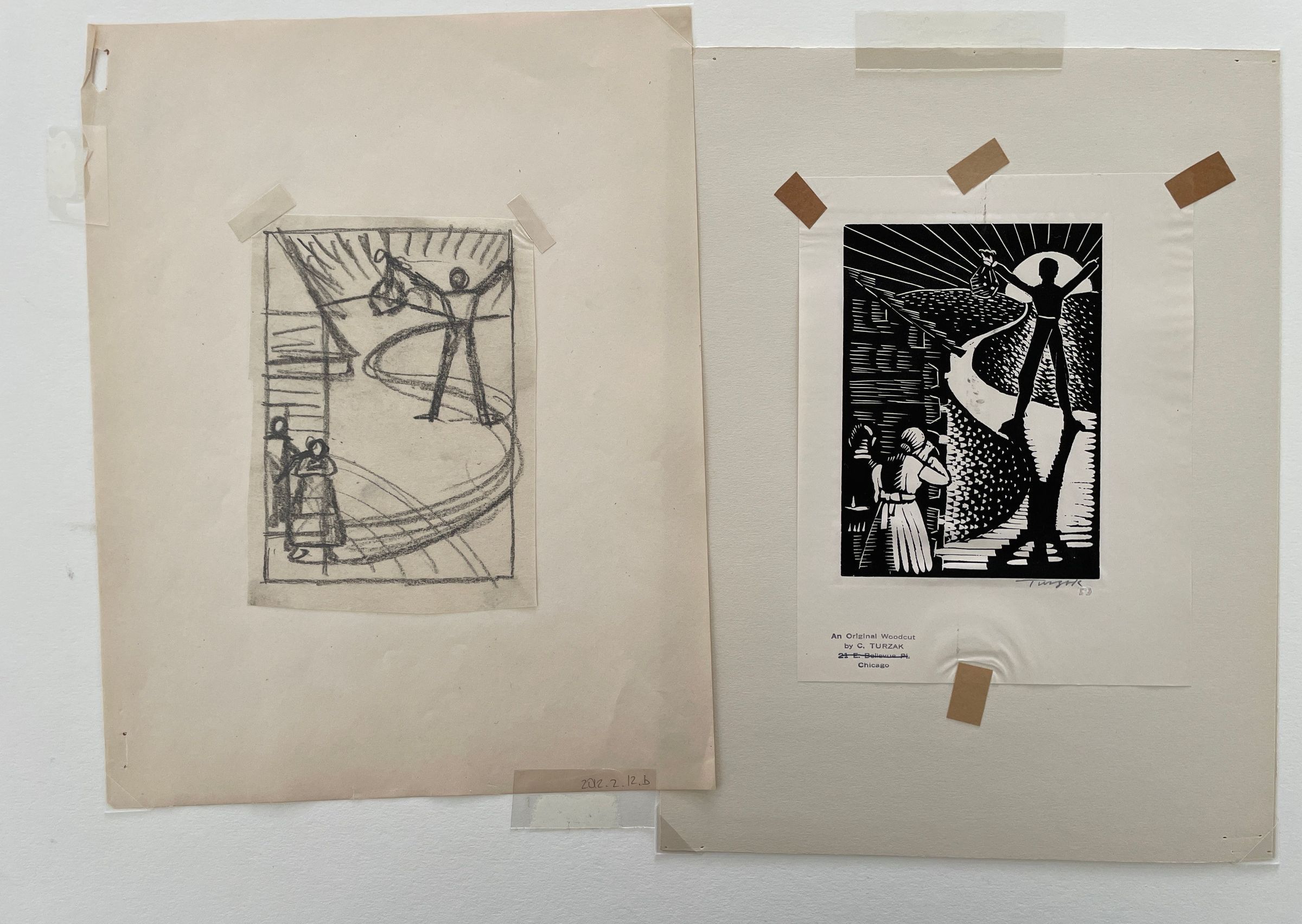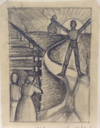 Preliminary and composite sketch for "Biography of Abraham Lincoln in Woodcuts". A figure stands on a path arms outstretched silhouetted by the sun, in his left arm he holds a bag. The viewer sees the back of two figures standing in the bottom of the page next to a log cabin. one a woman in tears the other an man. Printed in the United States at Chicago 1933 during 'A Century of Progress Exposition'"Collection