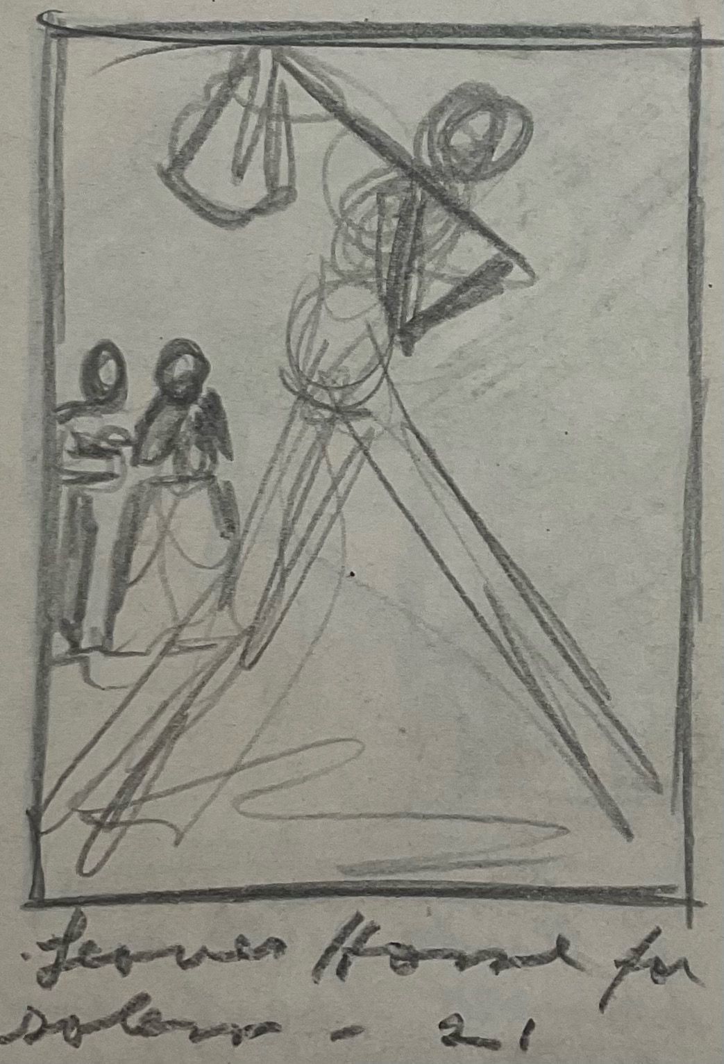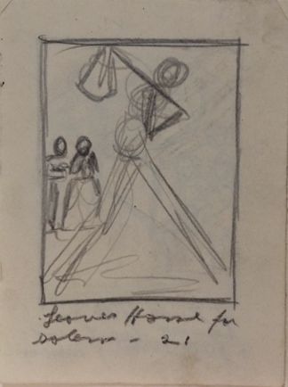 Preliminary and composite sketch for "Biography of Abraham Lincoln in Woodcuts". A central figure carries a bindlestiff, while a male and female figure stand in the background.Collection