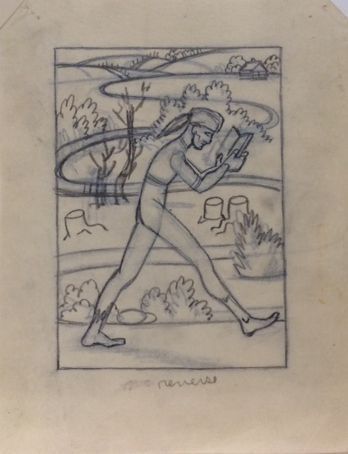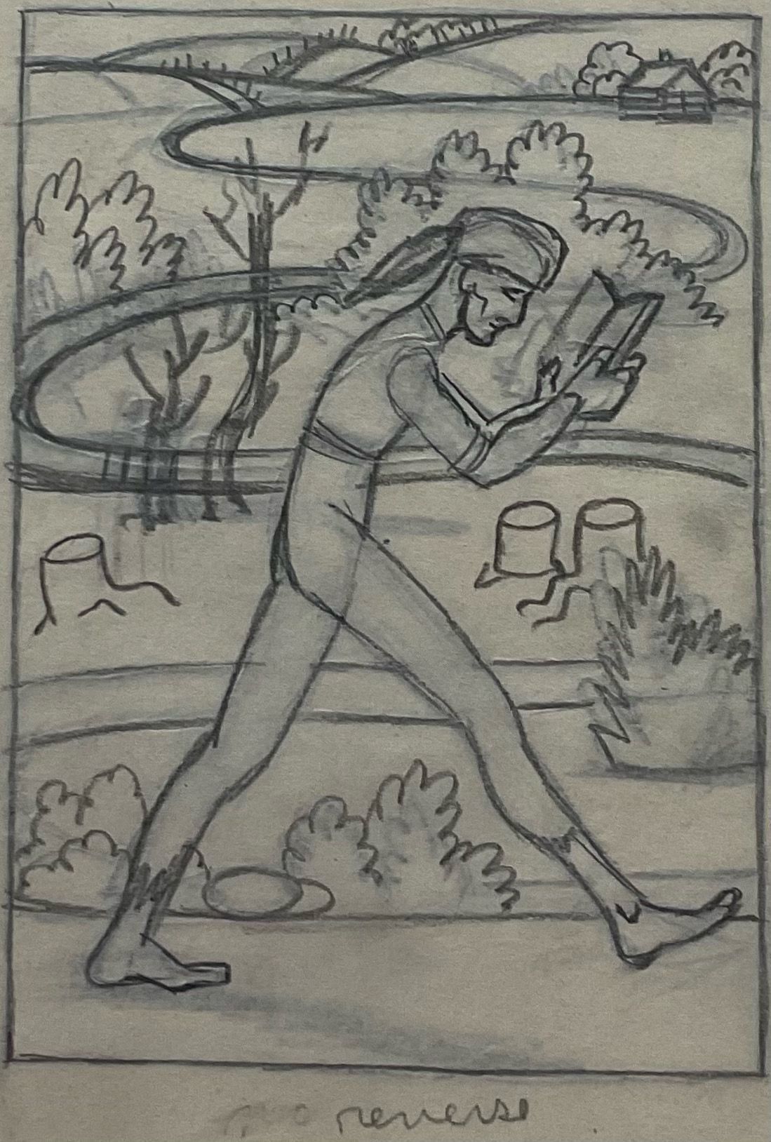 Preliminary and composite sketch for "Biography of Abraham Lincoln in Woodcuts". A young man tall and clean shaven walks along a road reading a book. the road continues to wind along until it reaches a cabin in the background. Printed in the United States at Chicago 1933 during 'A Century of Progress Exposition'"Collection
