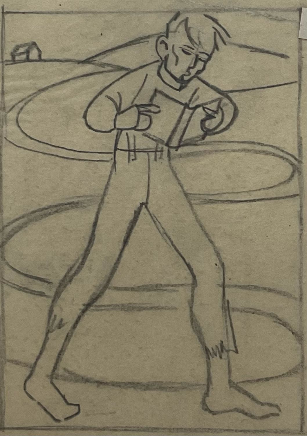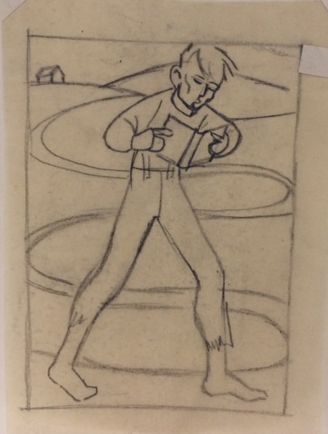Preliminary and composite sketch for "Biography of Abraham Lincoln in Woodcuts". A young man tall and clean shaven walks along a road reading a book. the road continues to wind along until it reaches a cabin in the background. Printed in the United States at Chicago 1933 during 'A Century of Progress Exposition'"Collection