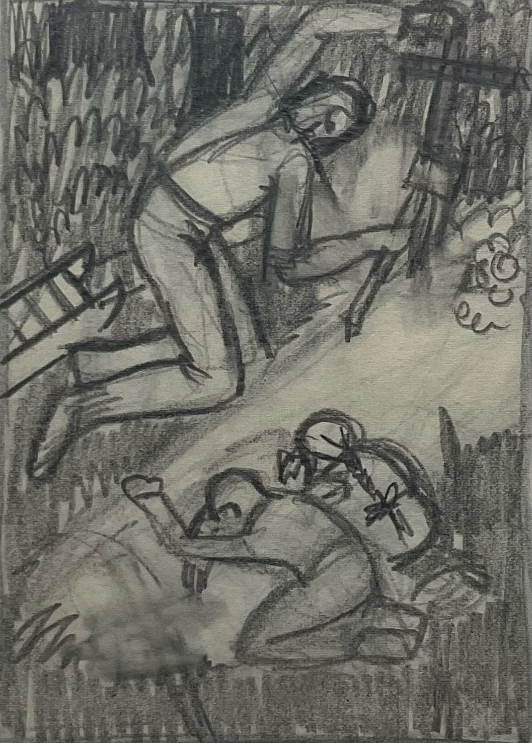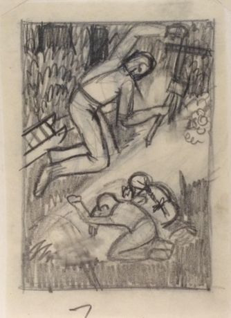 A man sharpens the end of a cross over a fresh grave. Two small children lie prostrate over bottom of grave grieving. Printed in the United States at Chicago 1933 during 'A Century of Progress ExpositionCollection