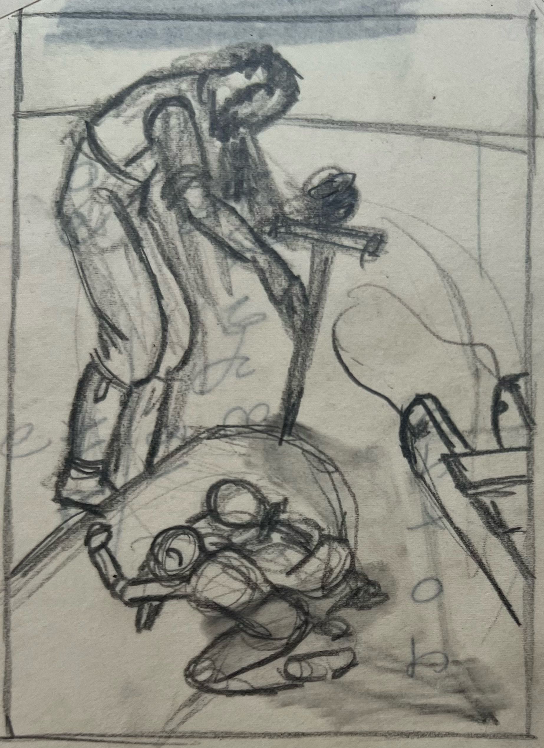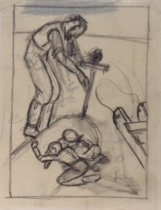 Preliminary and composite sketch for "Biography of Abraham Lincoln in Woodcuts". A man places a cross over a fresh grave. Two small children lie prostrate over bottom of grave grieving while a dark figure stands in the background with a shovel.printed in black ink initialed CT middle of lower middle of page.1933 by Charles Turzak" Printed in the United States at Chicago 1933 during 'A Century of Progress Exposition'Collection