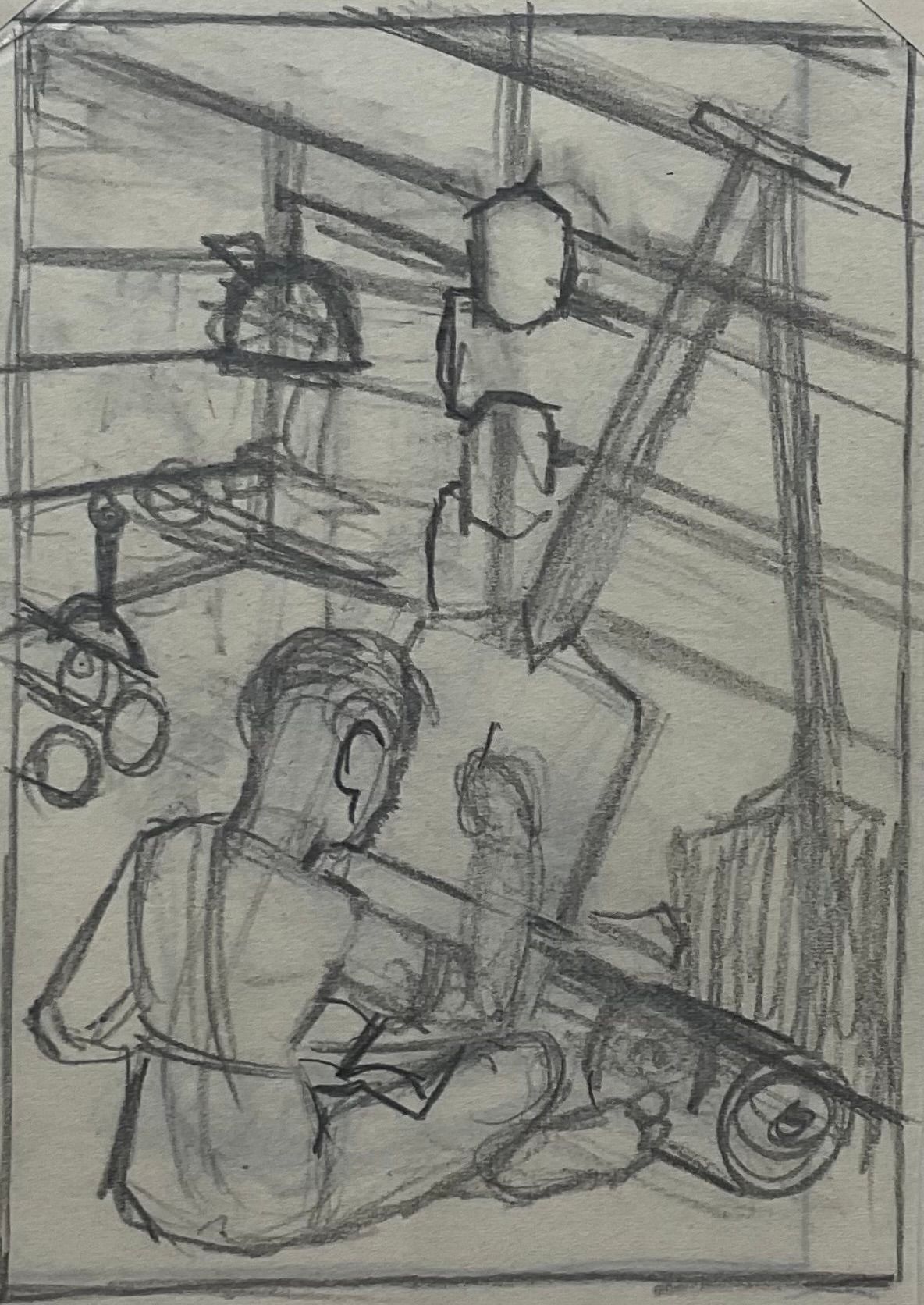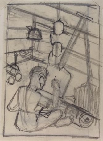 A Preliminary and composite sketch for "Biography of Abraham Lincoln in Woodcuts". Young Abe sits in front of fireplace writing on a shovel, a kettle simmers over a fire in the fire place. Printed in the United States at Chicago 1933 during 'A Century of Progress Exposition'"Collection