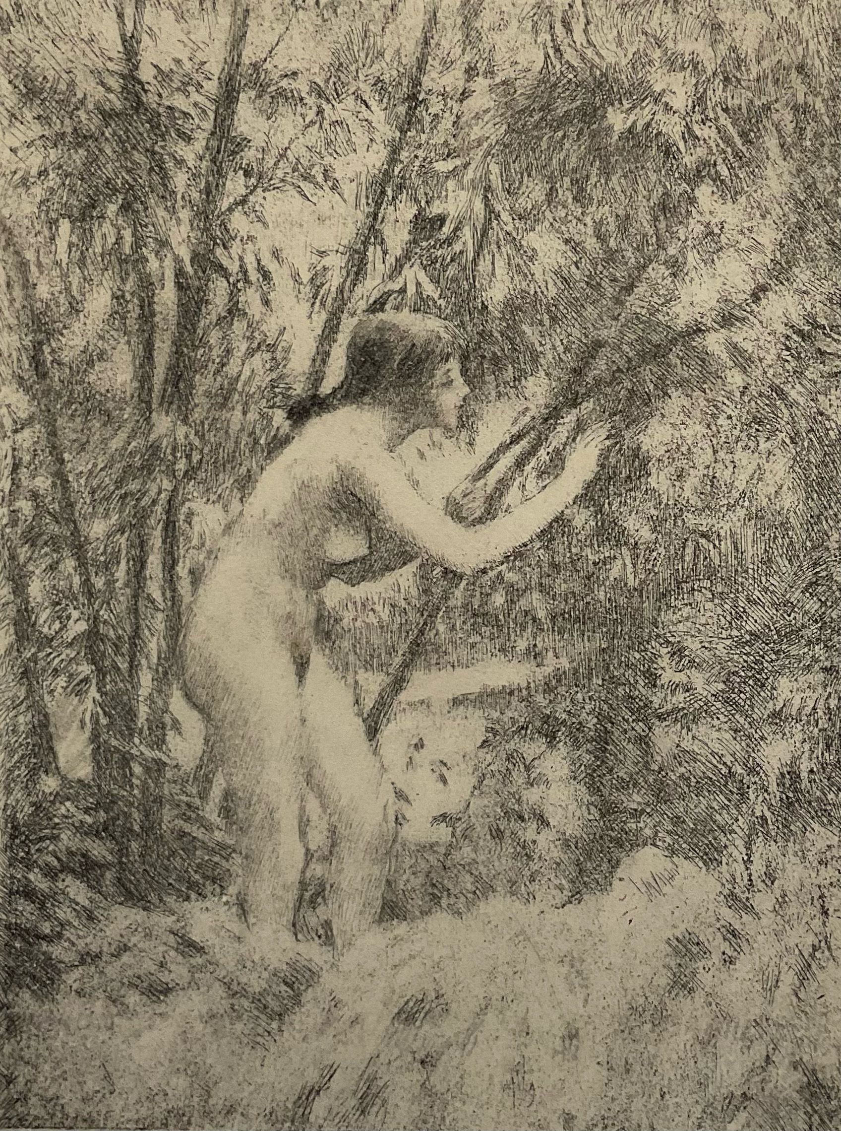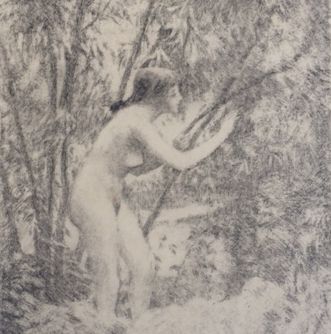Female nude figure standing outside in deep grass with dense trees and foliage in the background, figure in profile crouched slightly while parting tree branches to look through the foliage.Artwork Details