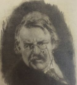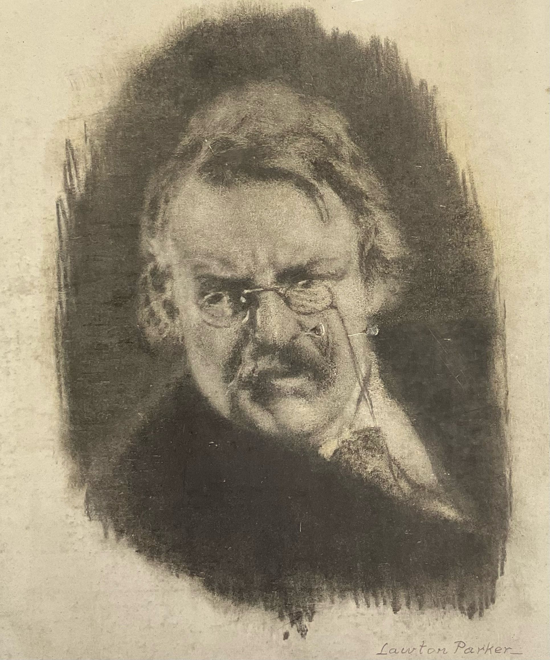 Portrait, entitled Gilbert Chesterson, older man depicted with prince-nez spectacles on a chain, and wearing a jacket and tie.Description