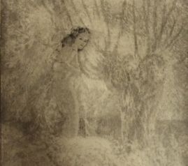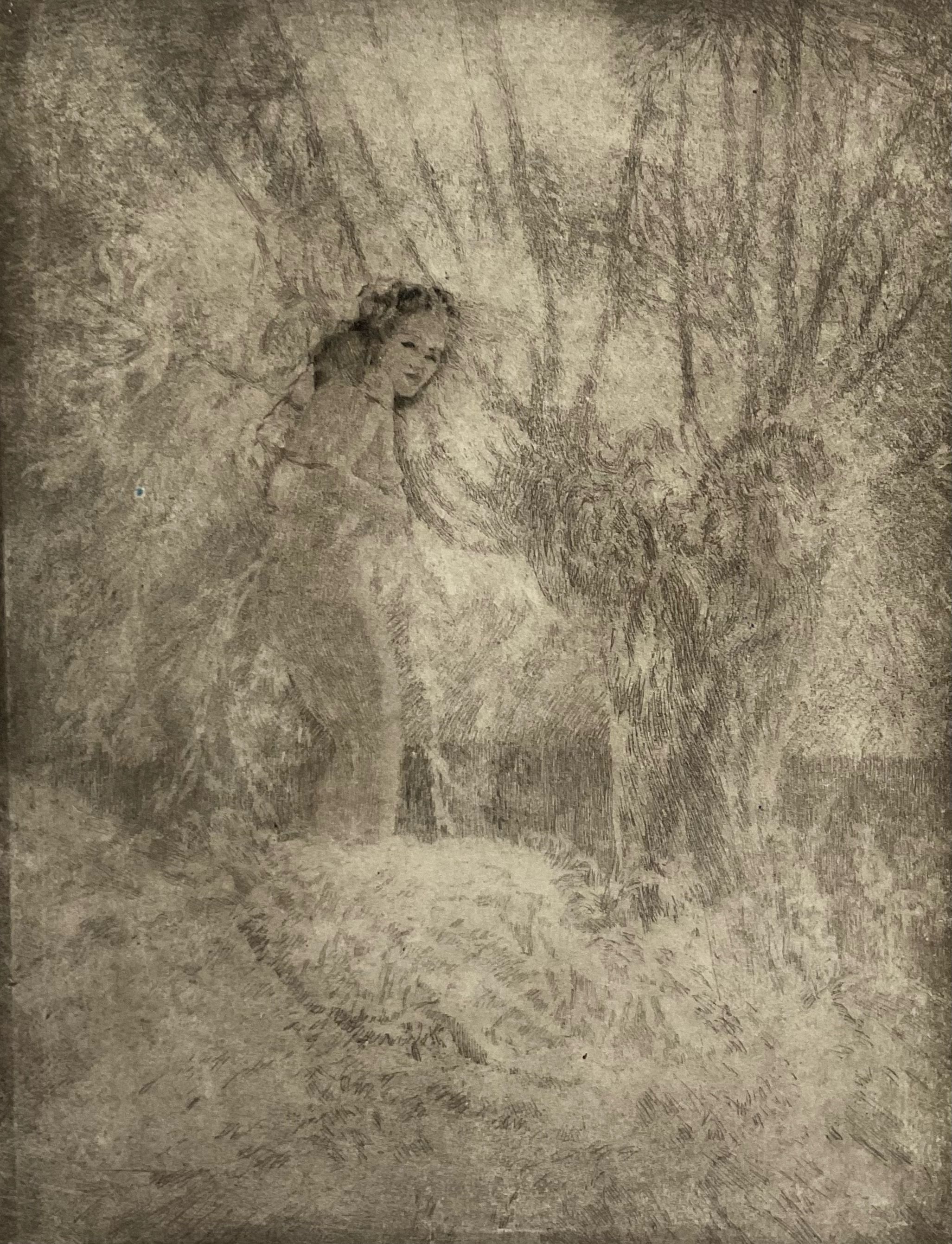 Female figure in a standing, but slightly crouched position. She is looking over her shoulder at the viewer. Her face and hair are darker than the rest of the piece, and she is standing amongst faded and abstracted tree branches and foliage. At the bottom of the piece is printed "Plate 4" and the initials P.B.Artwork Details