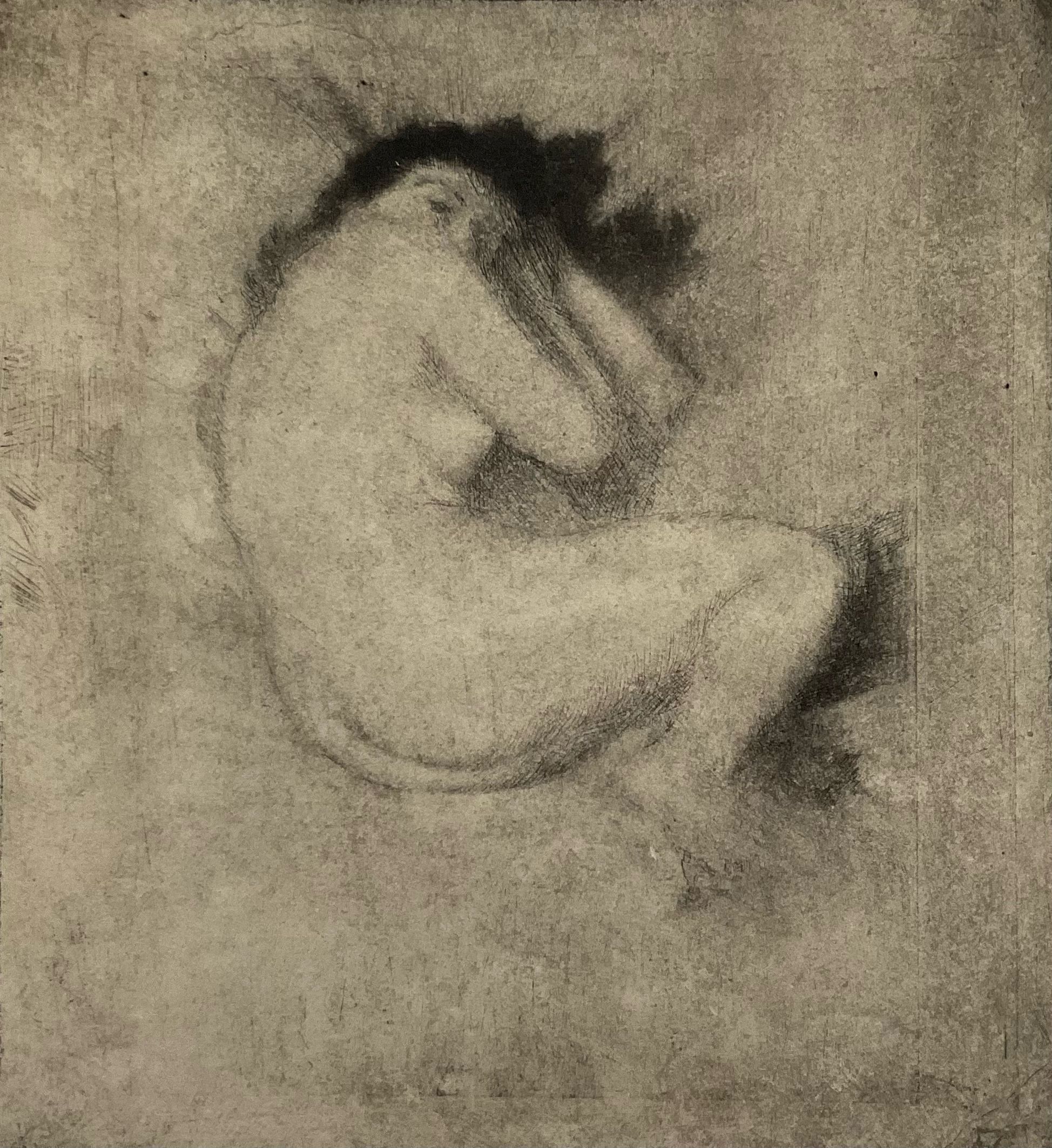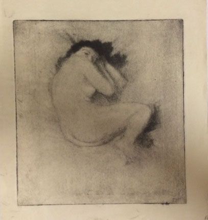 Female nude figure laying in a fetal position, her arm and shoulder is obscuring her mouth so only her eyes and nose is showing.Artwork Details