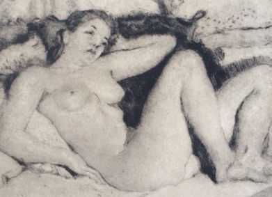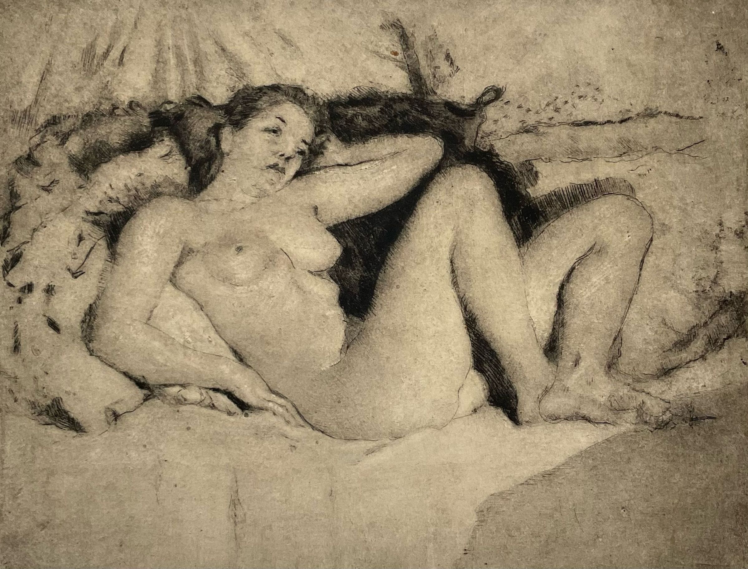 Female nude figure laying on a bed amongst blankets and sheets, her knees are drawn up, and she is in a reclining position with one hand behind her head. Signed lower right, annotated artist's proof.Artwork Details
