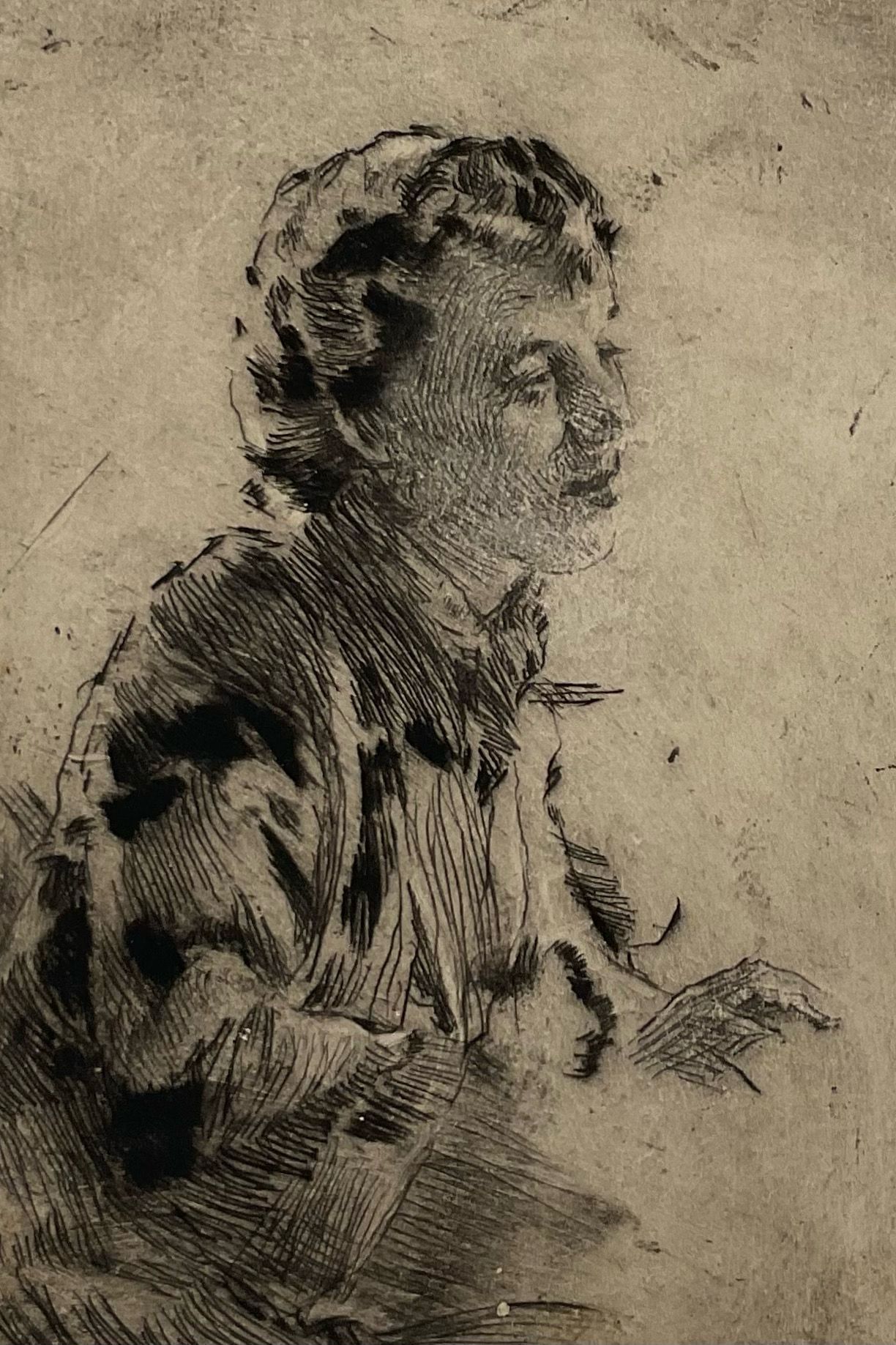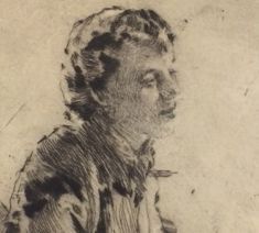 Side portrait of female figure from the chest up. Hands are placed on top of a table. Figure has short hair and is wearing a billowy top. She is looking to the side.Artwork Details