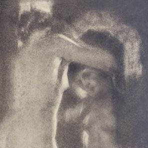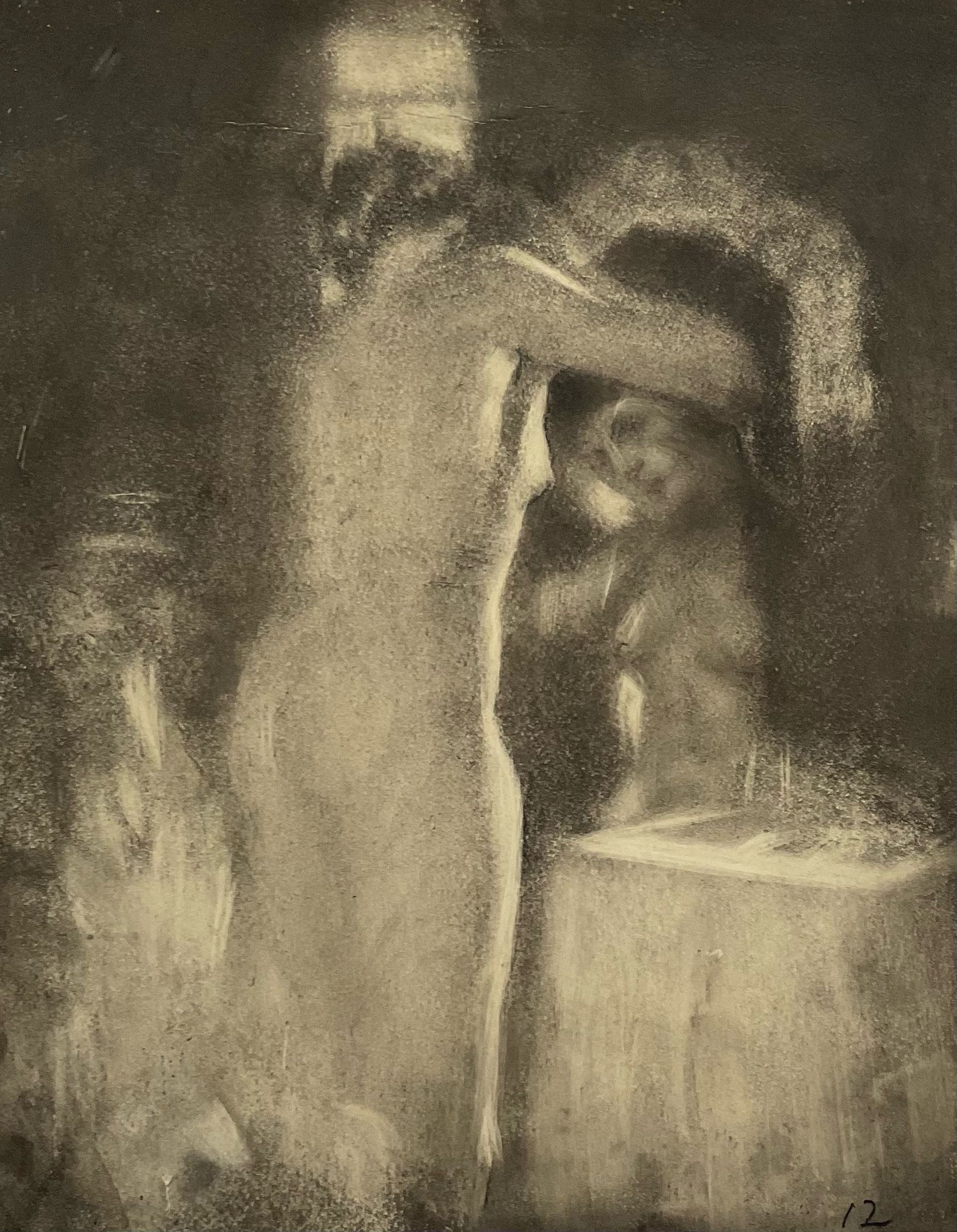Nude female figure standing in front of a mirrored vanity with her back to the viewer. She is posed with her hands up toward her head, fixing her hair. There is a window in the background.Artwork Details