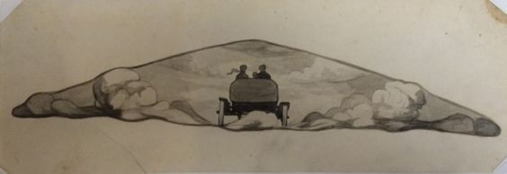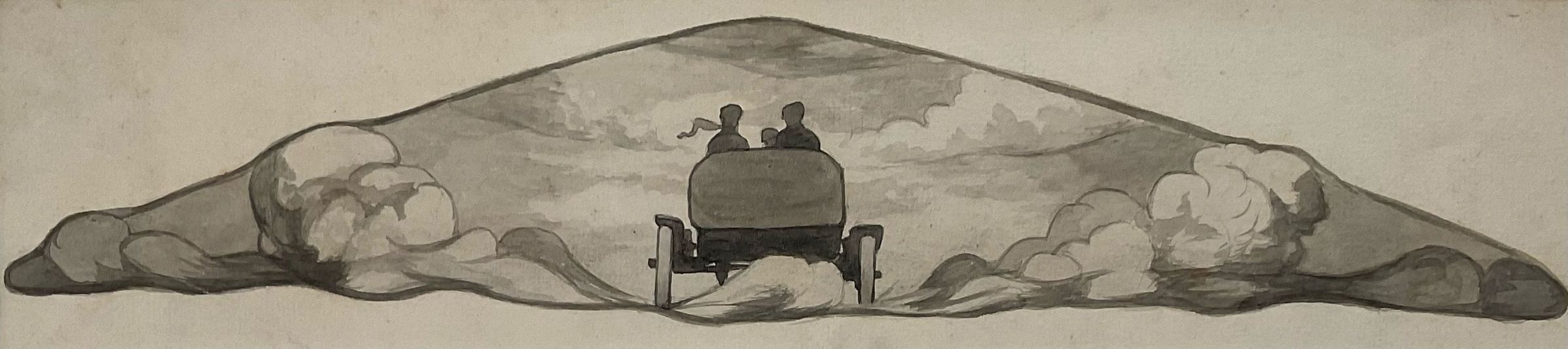 Triangular composition of the back side of a Model-T car driving away. Two people are sitting in the vehicle, one with a scarf flowing in the breeze. Clouds in the background.Acquisition