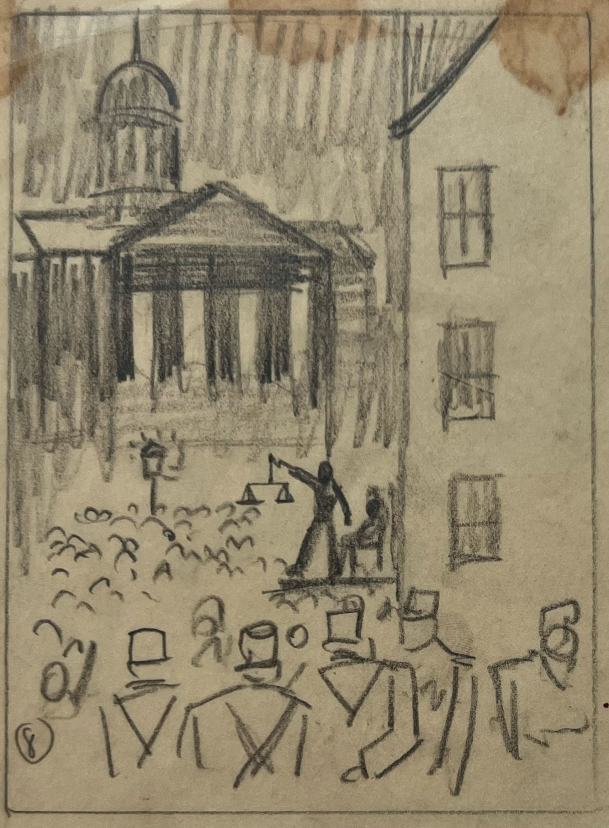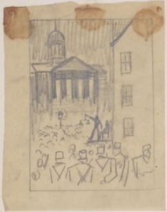 Preliminary rough and composite sketch for Turzak's book "Life of Abraham Lincoln in Woodcuts". Lincoln rides an enthusiastic crowd of supporters looks to his left at the capitol building " Printed in the United States at Chicago 1933 during 'A Century of Progress Exposition'"Collection