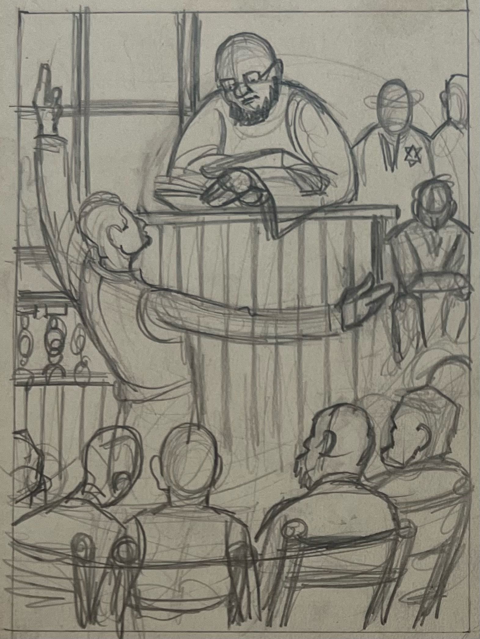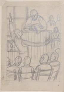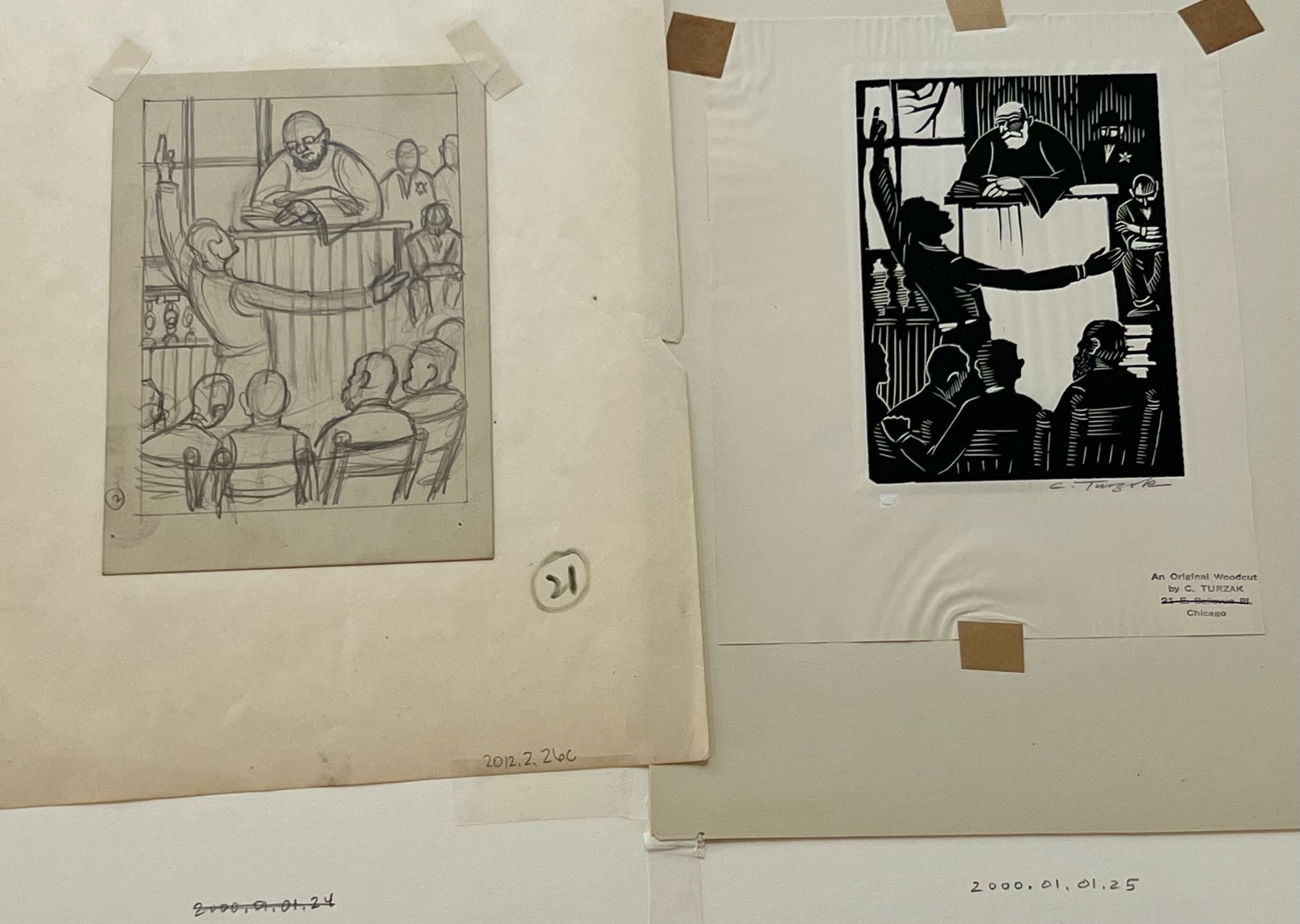 Preliminary and composite sketch for Turzak's book "Life of Abraham Lincoln in Woodcuts". Silhouette of man pleading a case to a judge man making wide gestures with his open arms. Judge sits at his bench while accused sits beside the judge a bailiff standing beside him. Printed in the United States at Chicago 1933 during 'A Century of Progress Exposition'"Collection