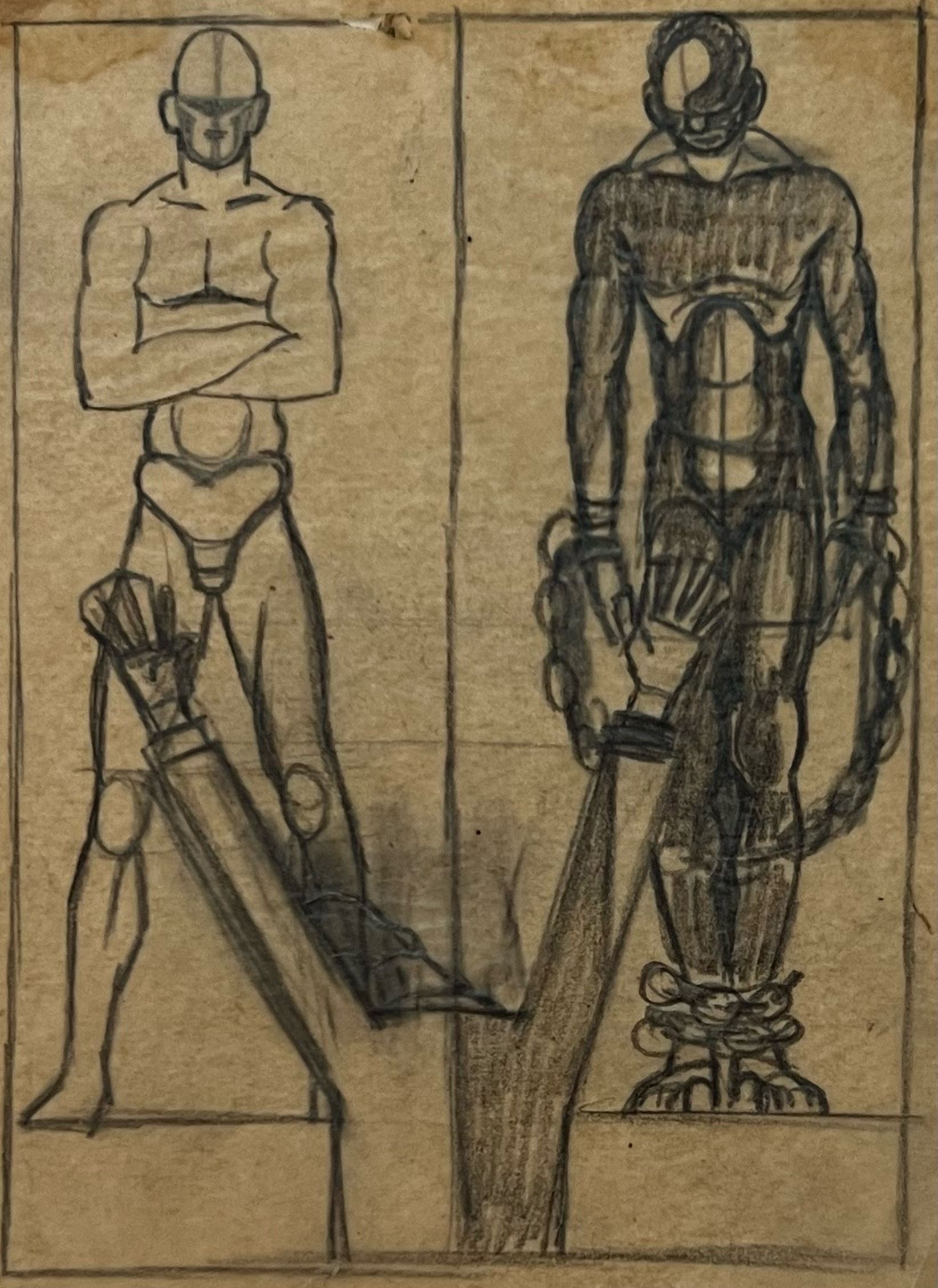 Composite and preliminary sketch for Turzak's book "Life of Abraham Lincoln in Woodcuts". Man stands with back to viewer in front of two men one white standing with arms crossed the other black with hands and feet in shackles. Printed in the United States at Chicago 1933 during 'A Century of Progress Exposition'"Collection