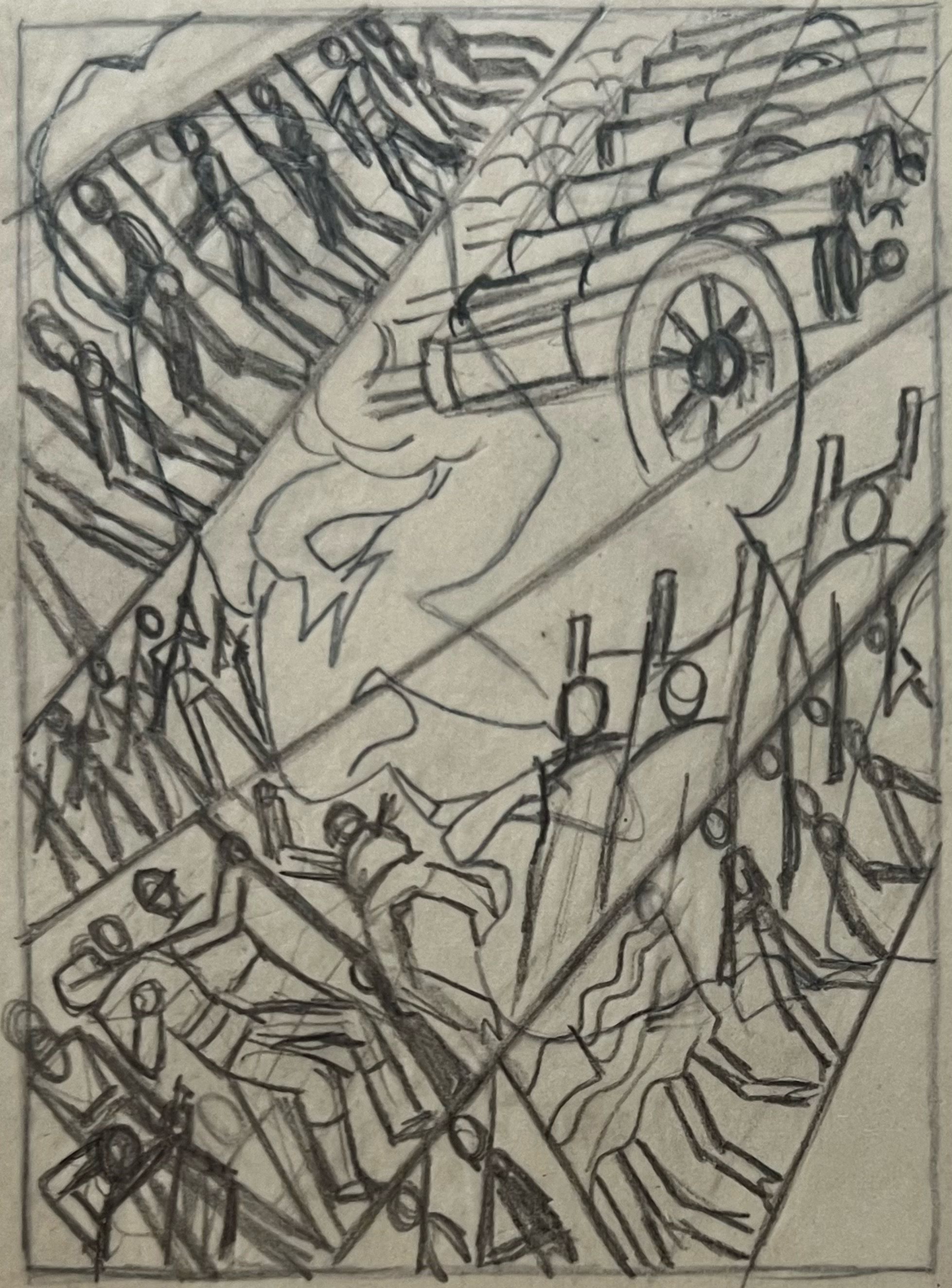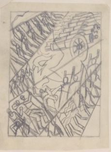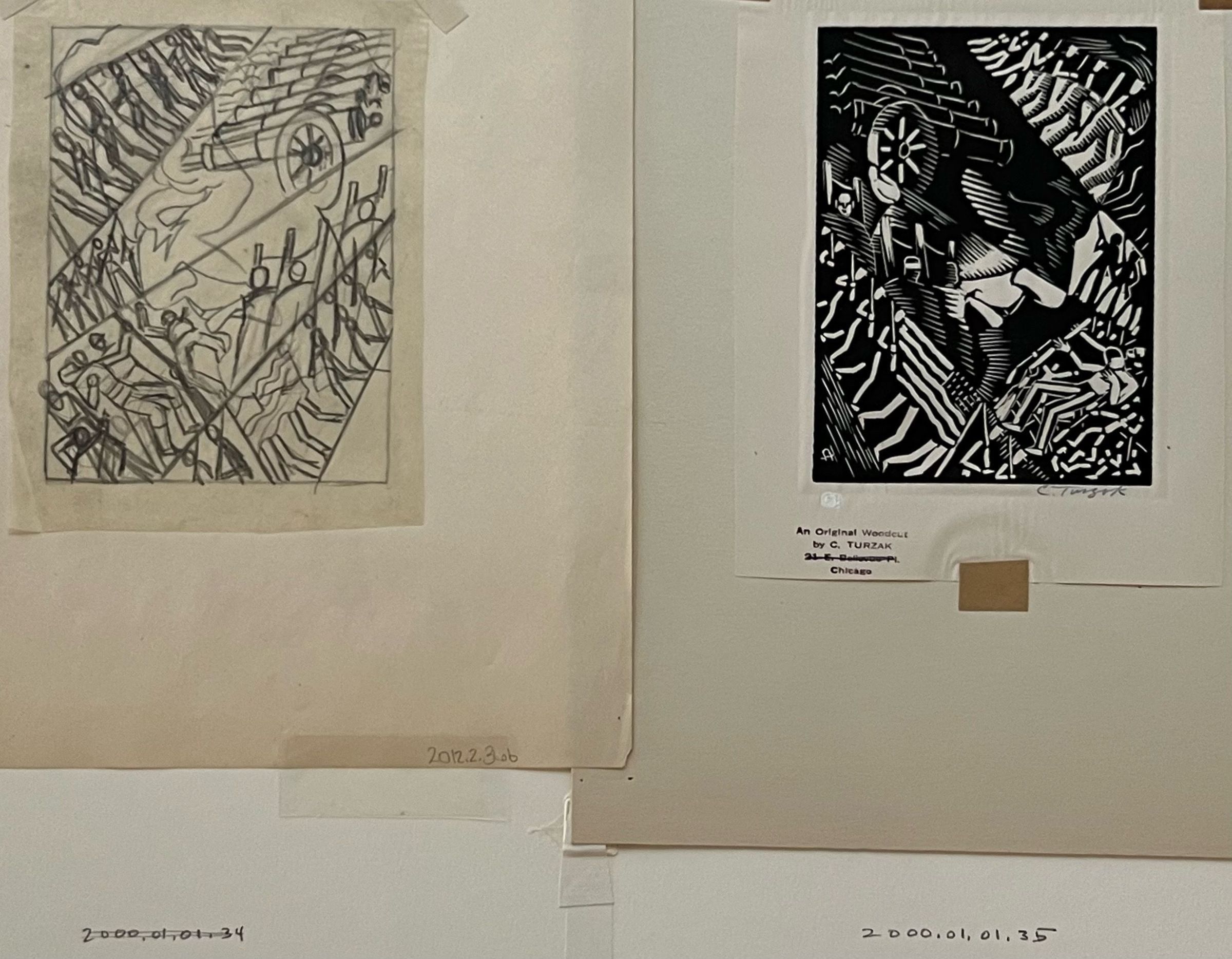Preliminary and composite sketch for Turzak's book "Life of Abraham Lincoln in Woodcuts". Side view of Lincoln's face superimposed by stylized image of war. Printed in the United States at Chicago 1933 during 'A Century of Progress Exposition'"Collection