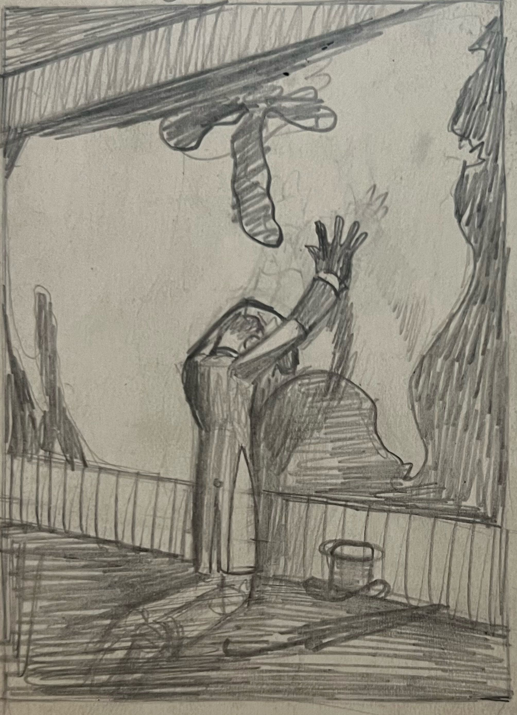Preliminary and composite sketch for Turzak's book "Life of Abraham Lincoln in Woodcuts". Lincoln kneels in front of a map of the United states his head in his left arm his right arm on the map. His hat and umbrella are on the floor beside him to his right. Printed in the United States at Chicago 1933 during 'A Century of Progress Exposition'"Collection