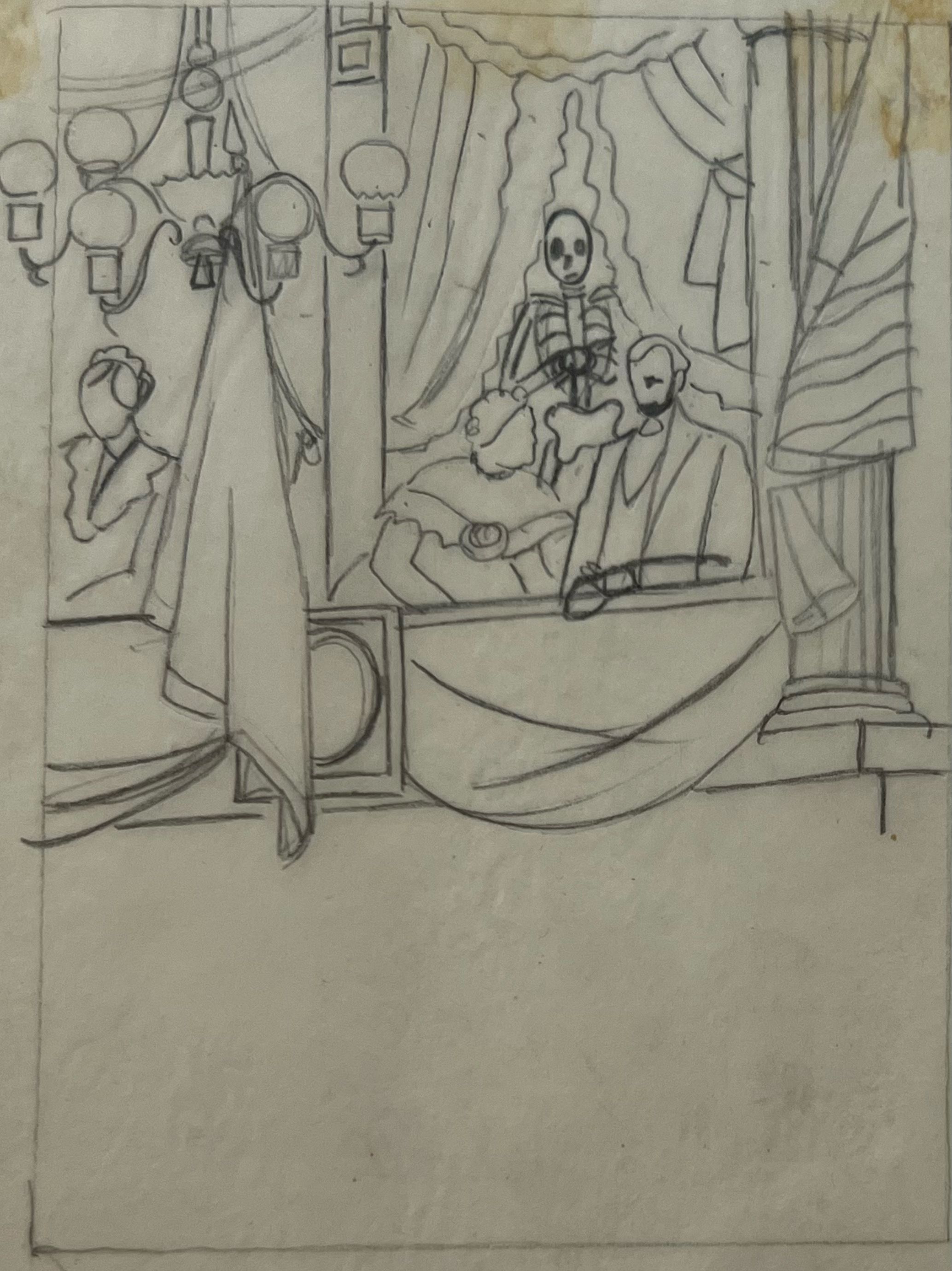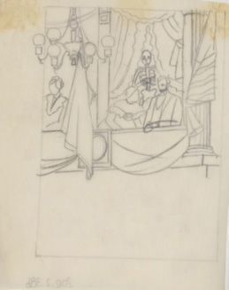 Preliminary and composite sketch for Turzak's book "Life of Abraham Lincoln in Woodcuts". Lincoln sits with wife in balcony watching a performance a skeleton stands behind the couple below them a woman sings while several other musicians play their instruments. Printed in the United States at Chicago 1933 during 'A Century of Progress Exposition'"Collection