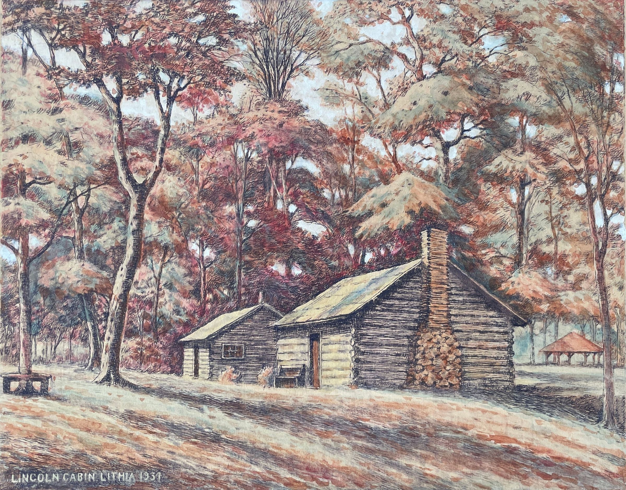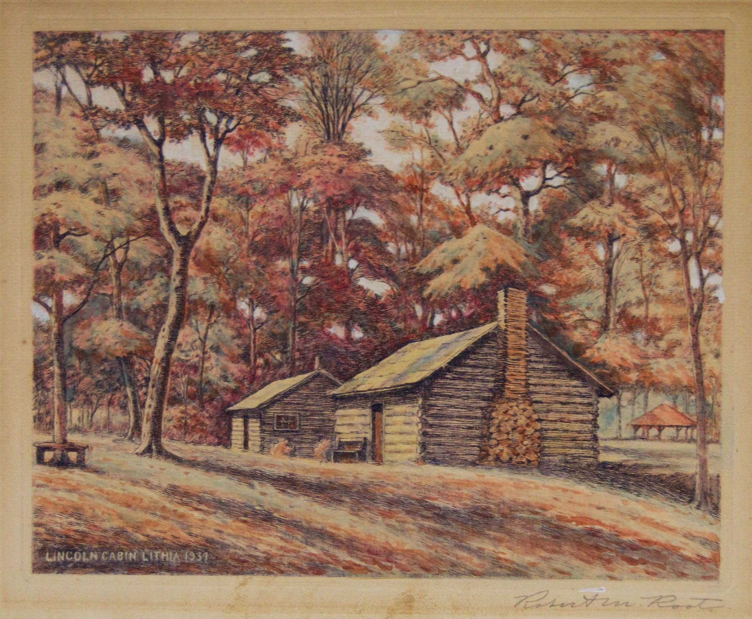 Wooded landscape with 2 log cabins (Lincoln Log Cabin); imprinted PR corner 'Lincoln Cabin Lithia'; signed 'Robert M. Root' in lower PL corner, in pencilArtwork Details