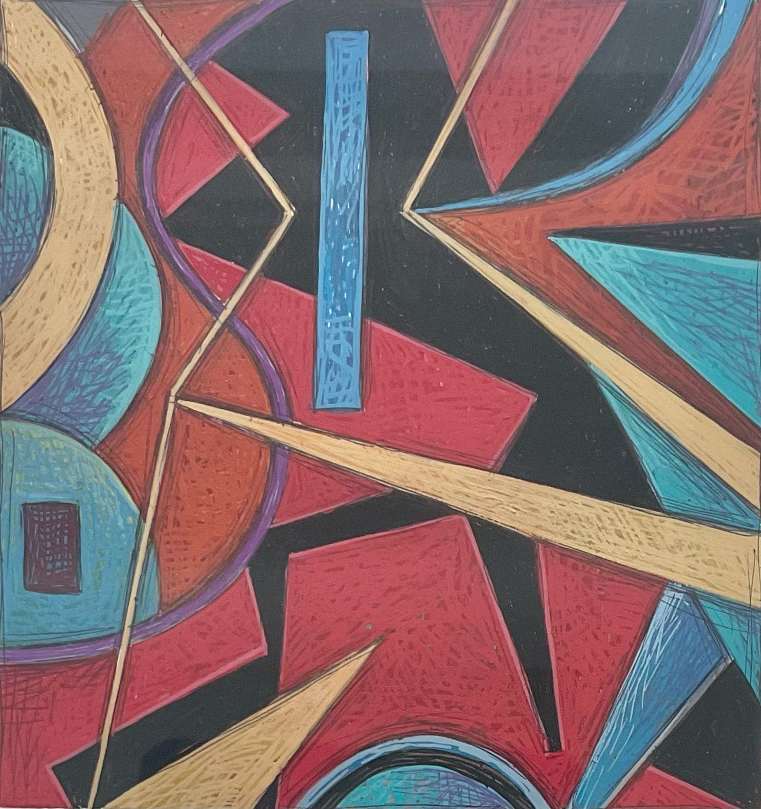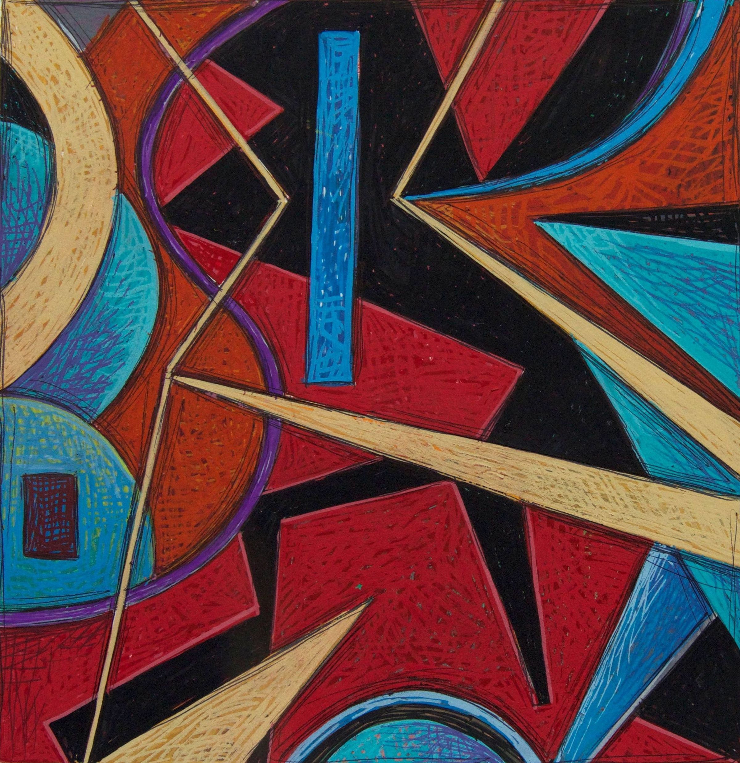 A composition of abstract shapes: geometric and quasi-geometric, and organic black, red, blue, purpose, and yellow/beige shapes overlapping each other. There is a textured effect of crosshatching to build up layers of paint; a purple "S" shape runs through the left side of the painting.Description