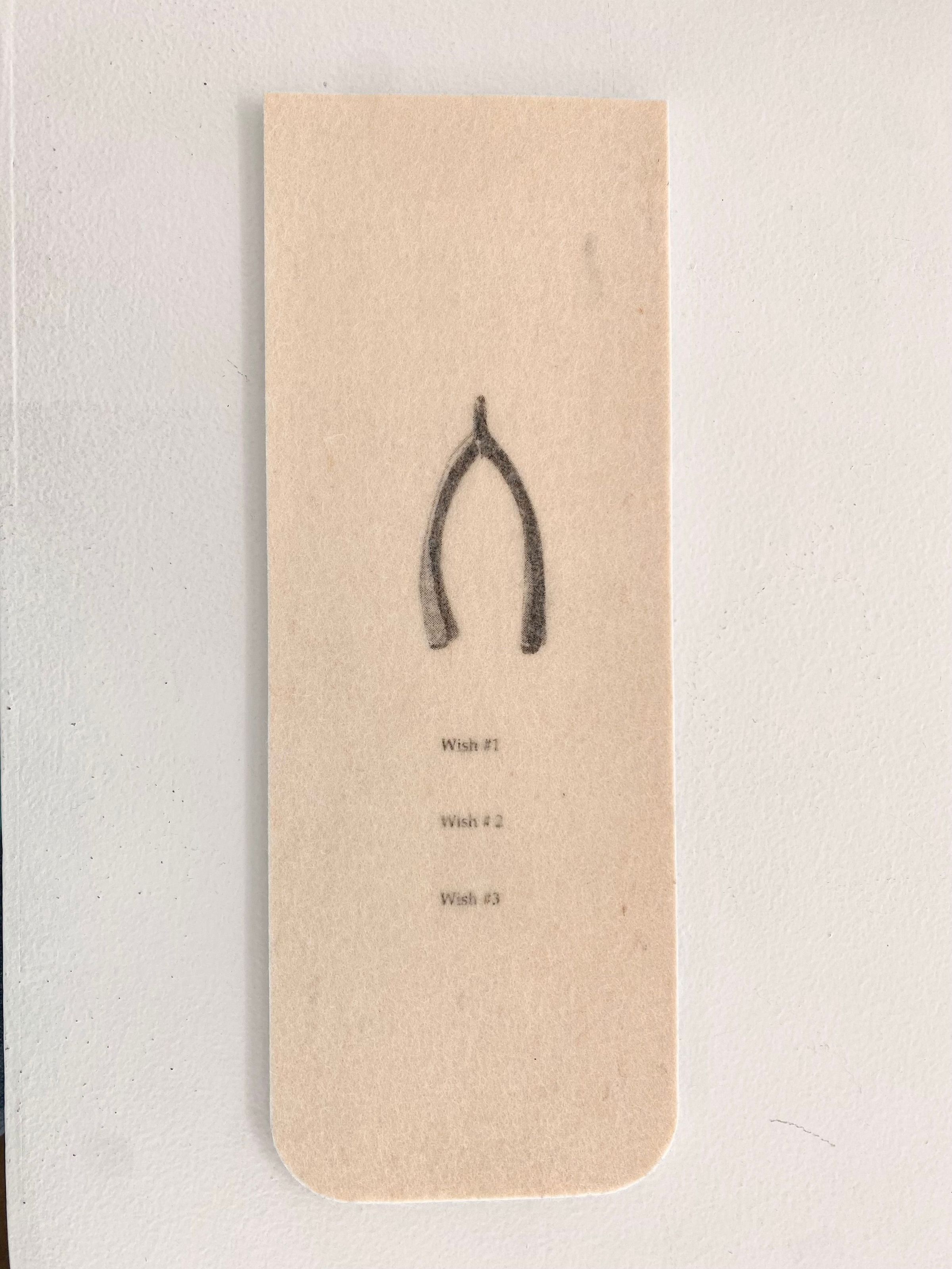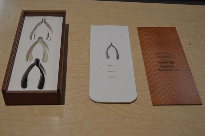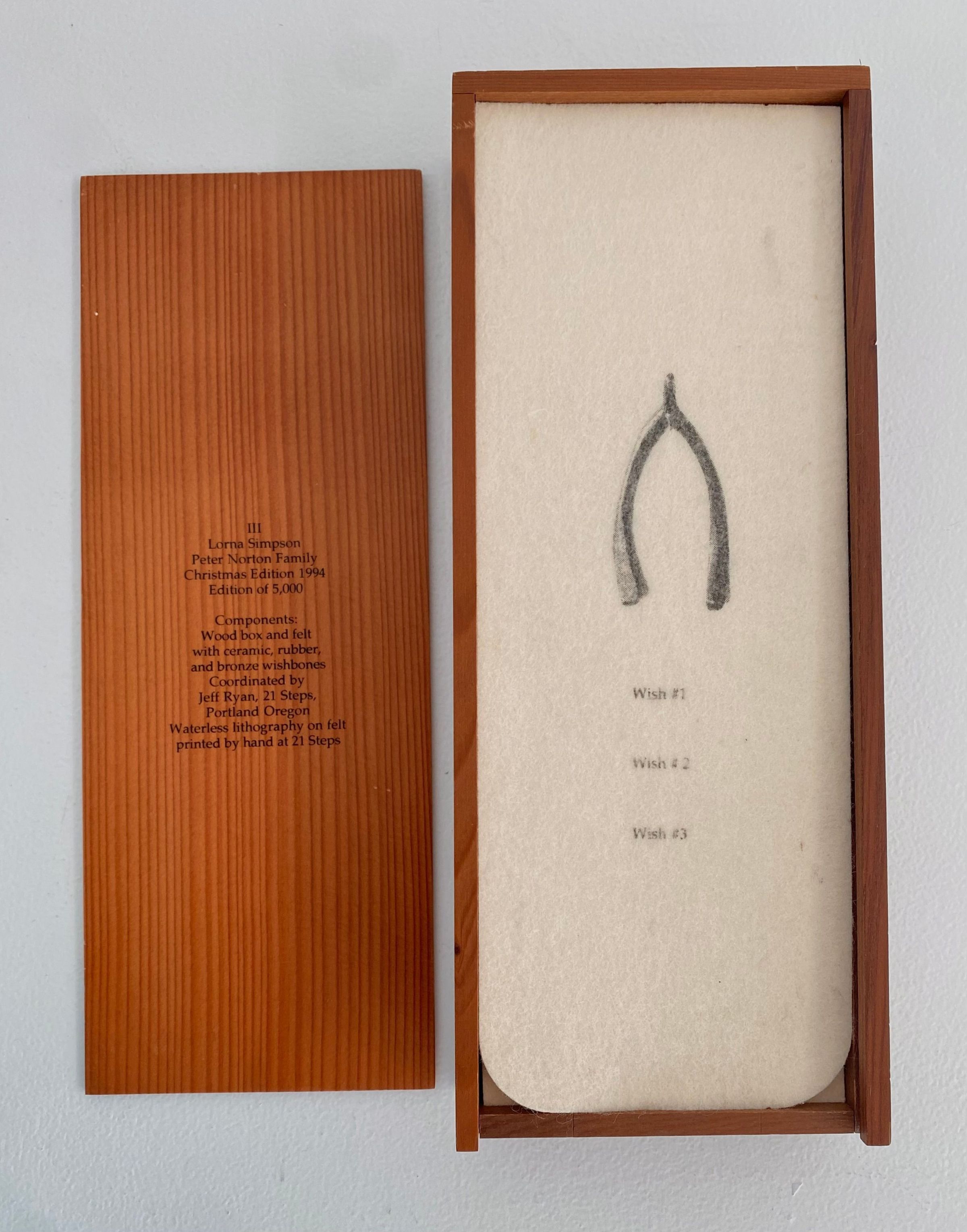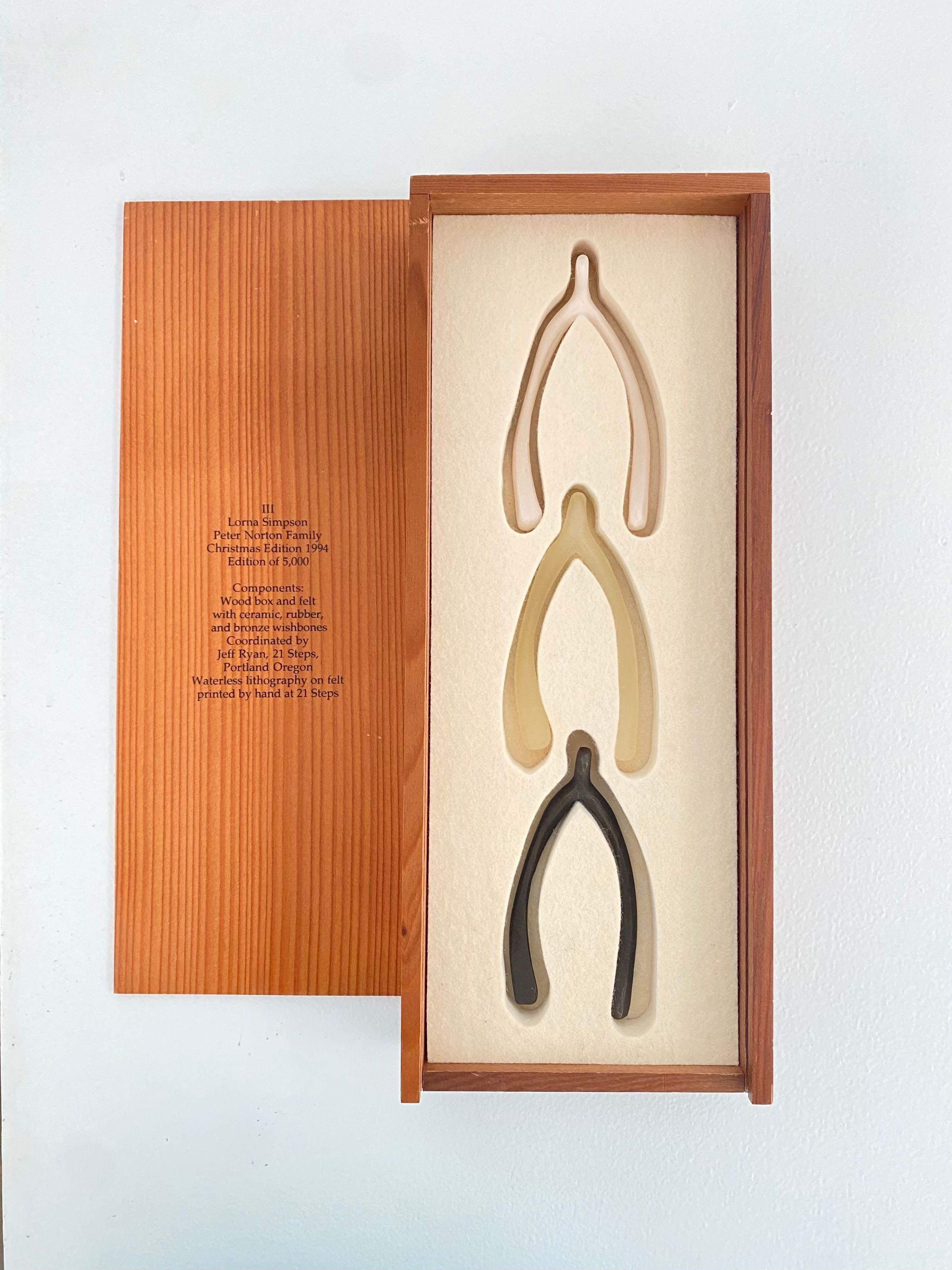 Wooden box with Roman numeral "III" engraved on lid. Lid slips out. Contains three wishbone inside: one ceramic, one bronze, one latex. Wishbones held inside form-fitting felt. Waterless lithography printed on felt by hand.Collection