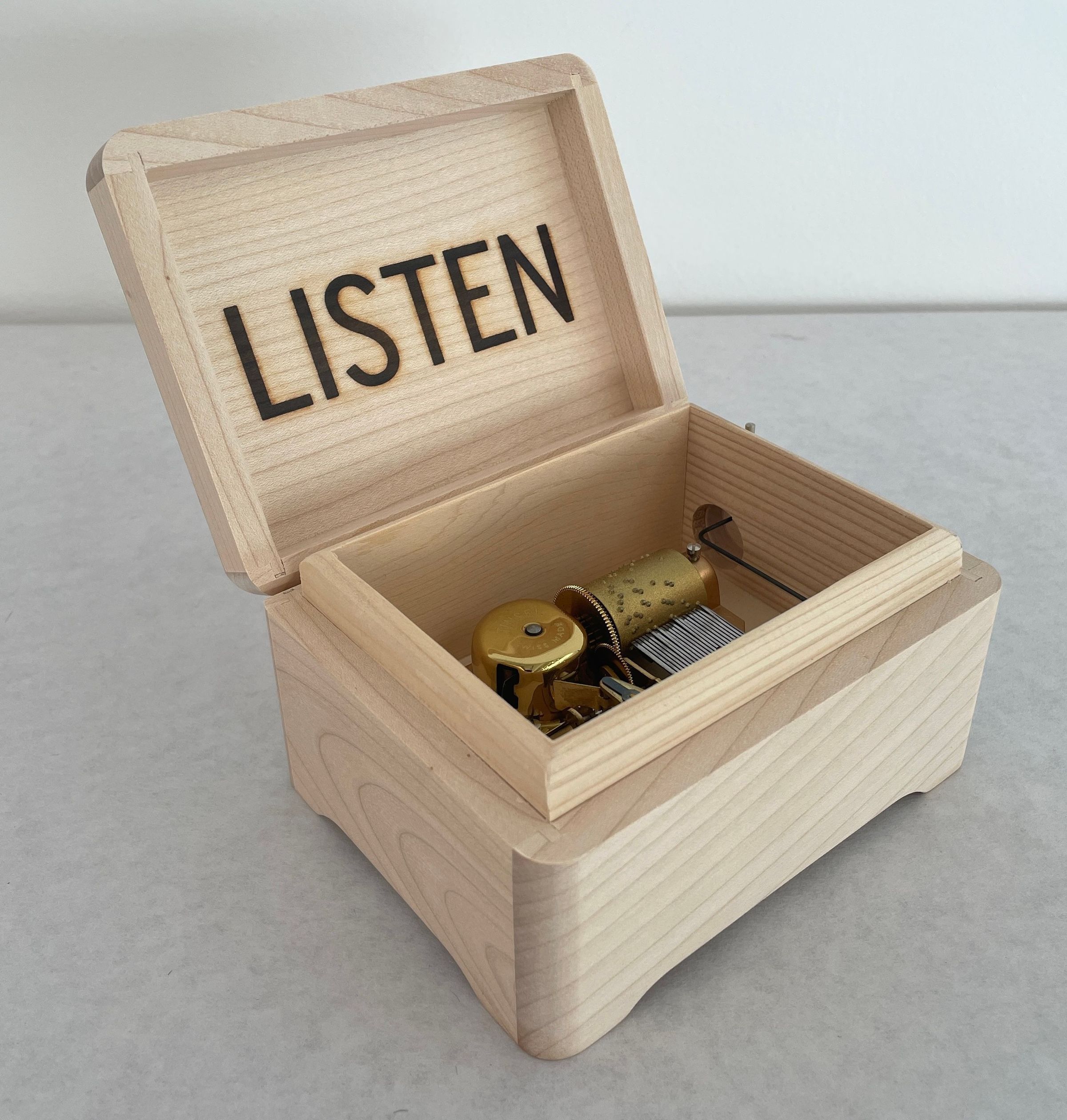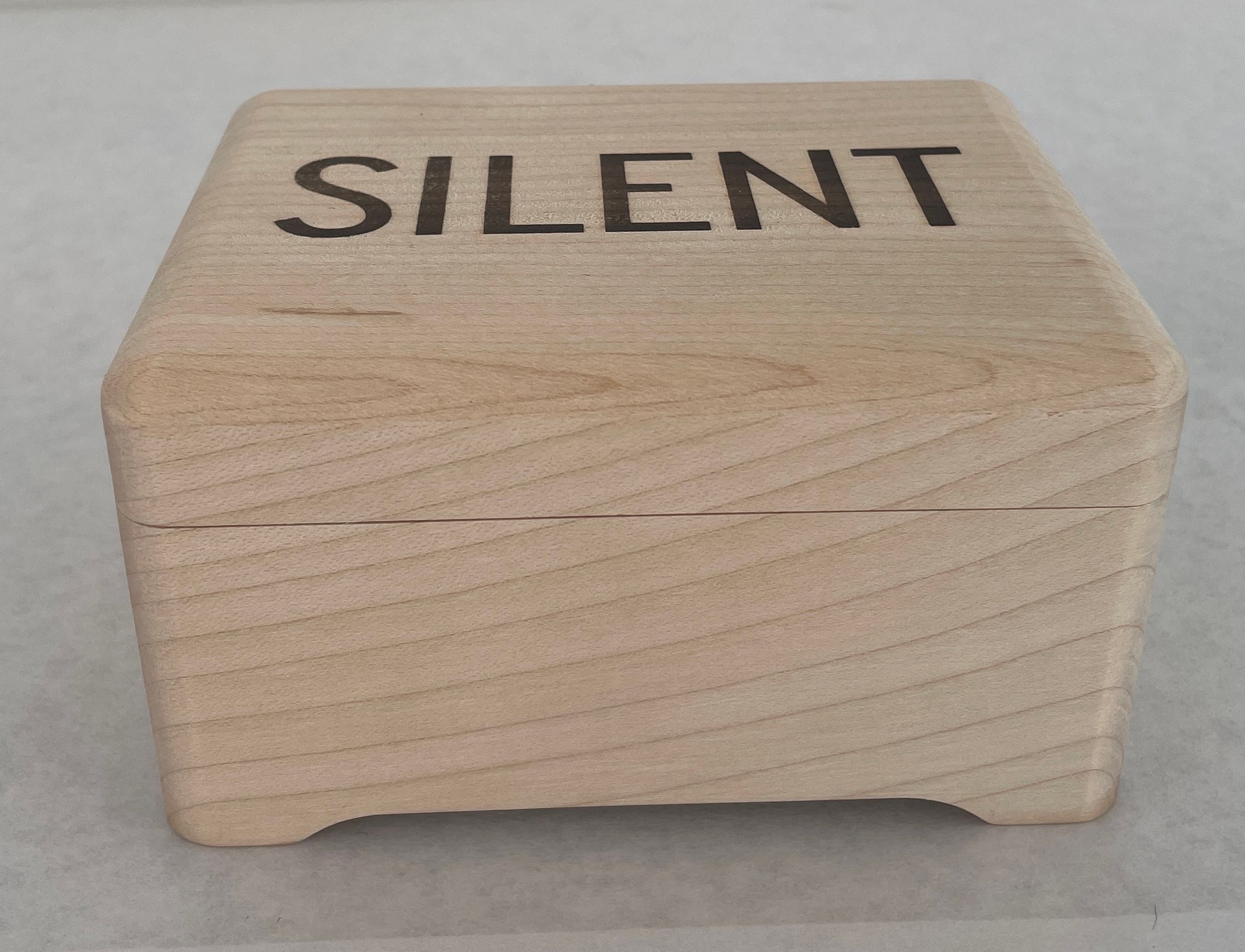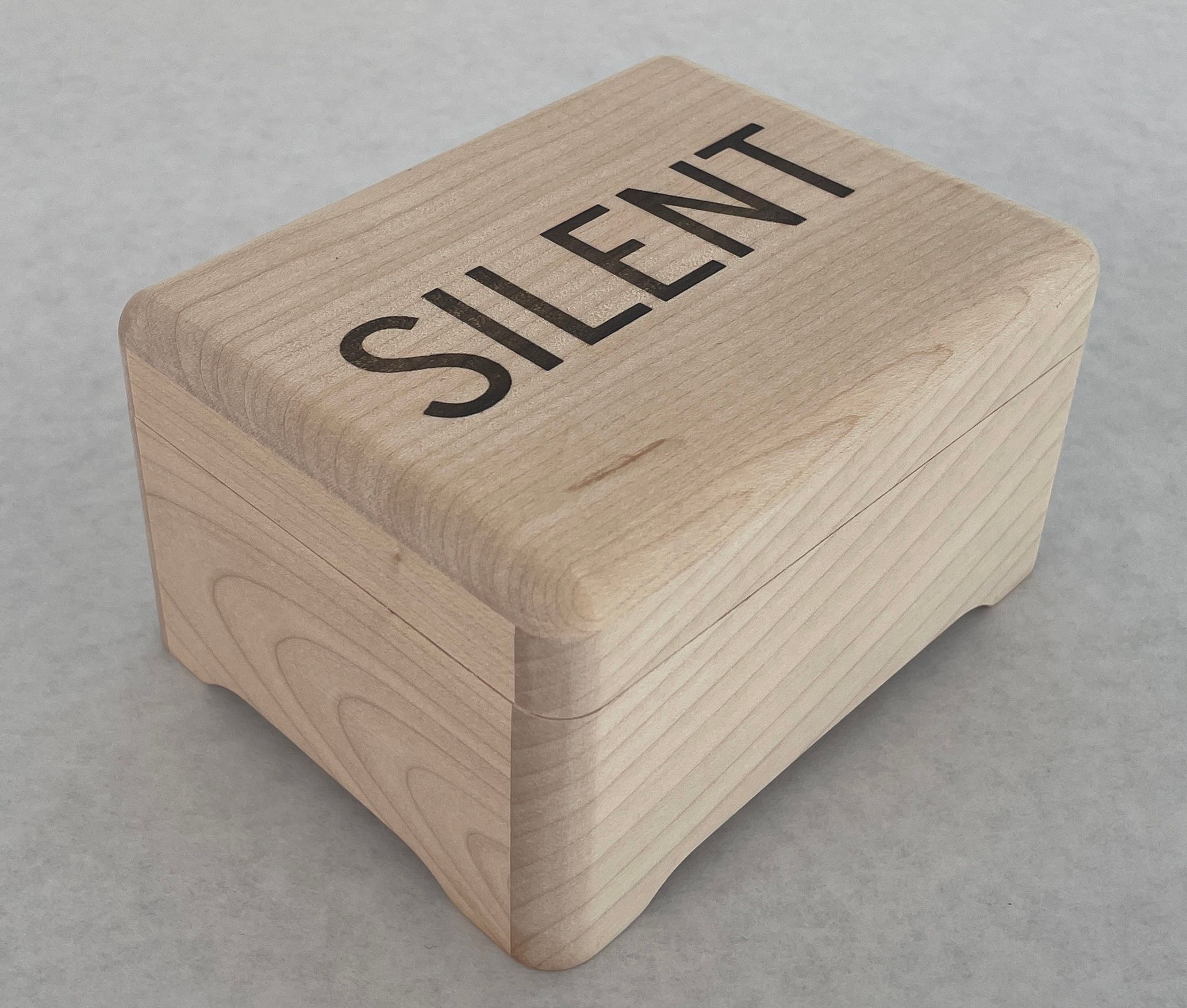 Carved pine box with a music box mechanism inside. Outside top of box is features dominant text reading "SILENT" carved in dark brown. Opens with hinges on one side to reveal music mechanism inside.Collection