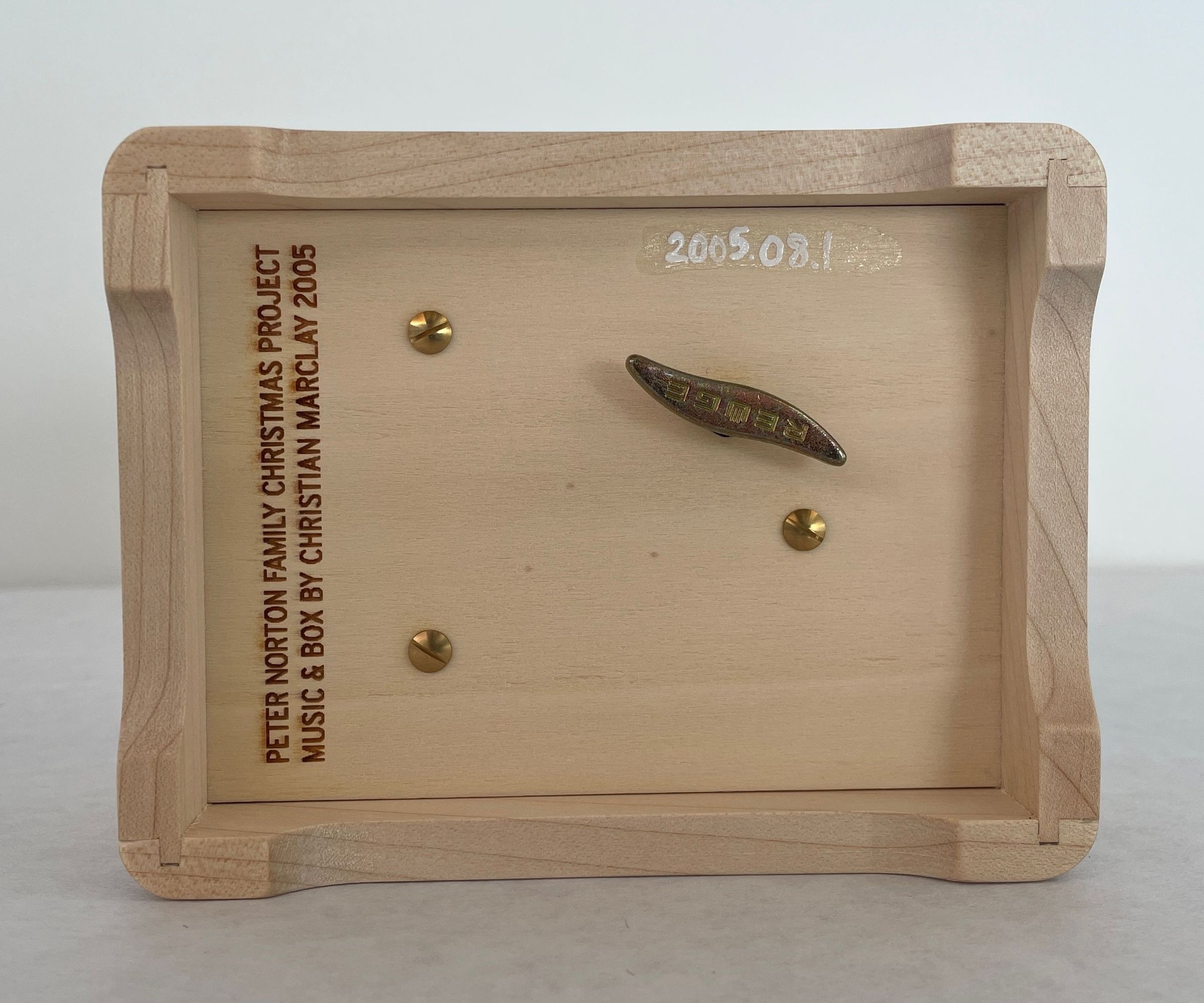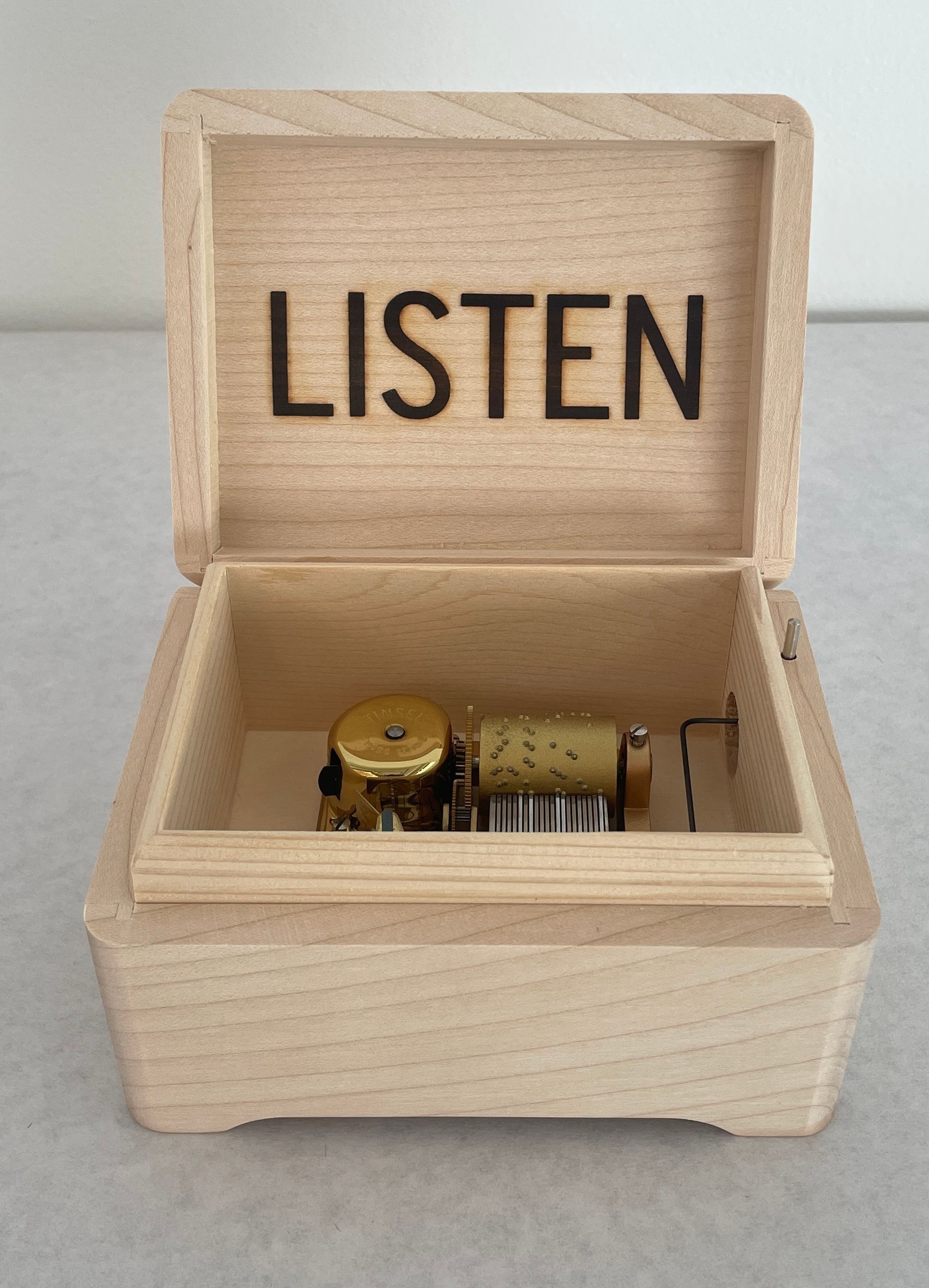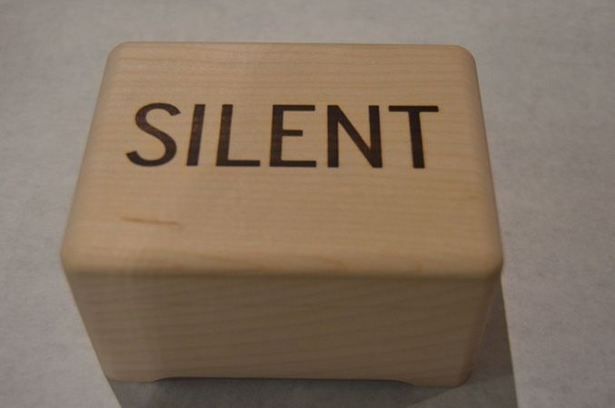 Carved pine box with a music box mechanism inside. Outside top of box is features dominant text reading "SILENT" carved in dark brown. Opens with hinges on one side to reveal music mechanism inside.Collection
