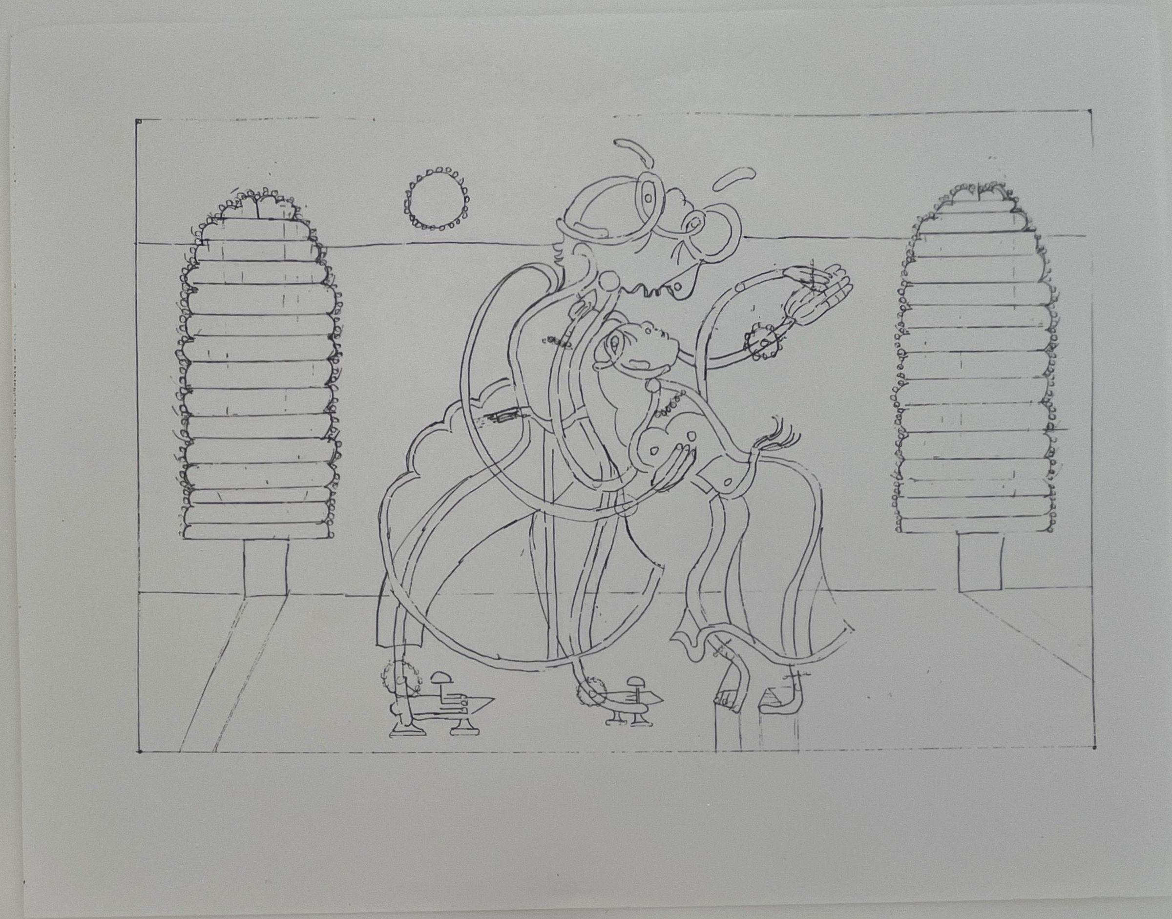 black and white study sketch for Moon Meet May. Trees in background are bordered with circle squiggles similar to the moon.