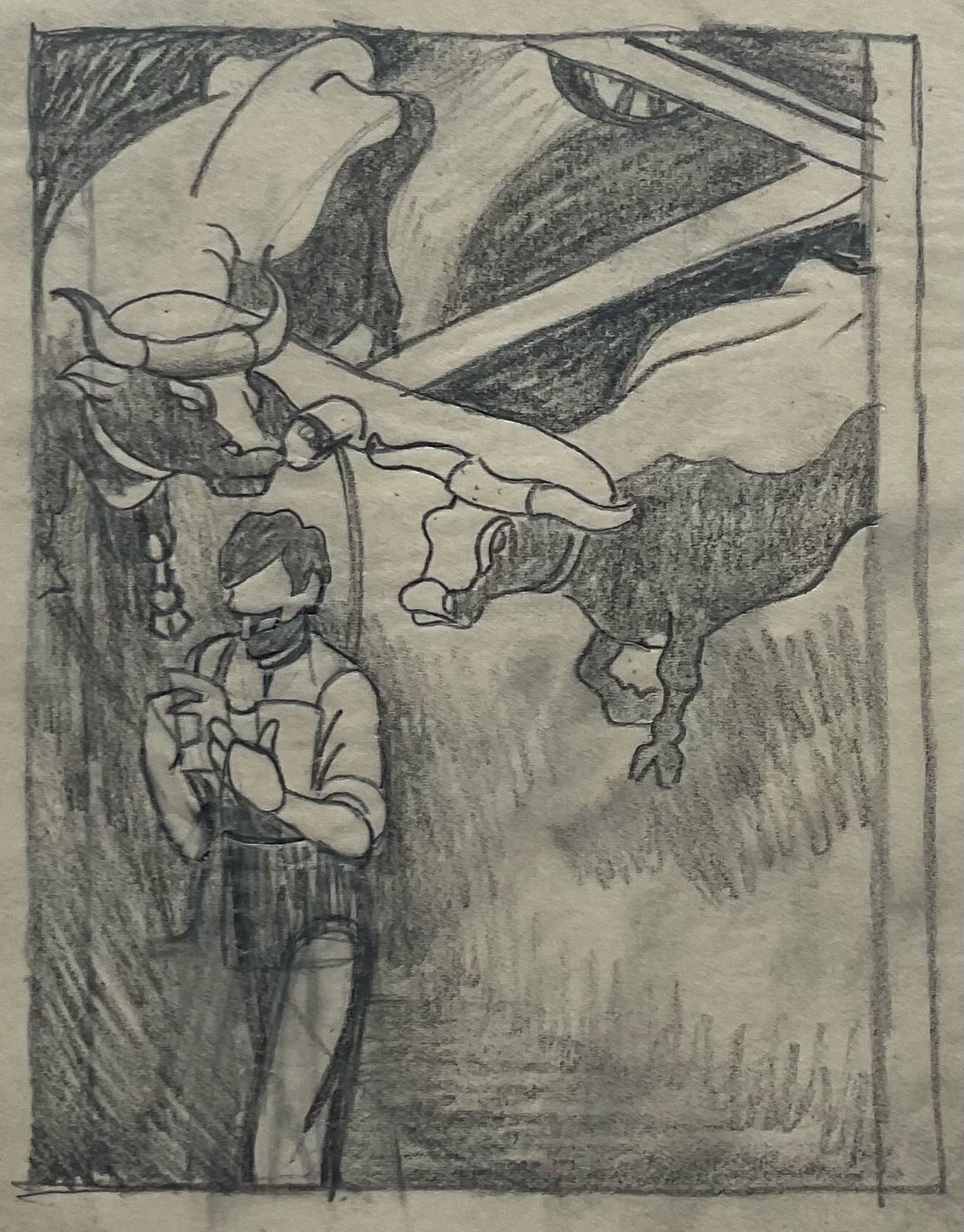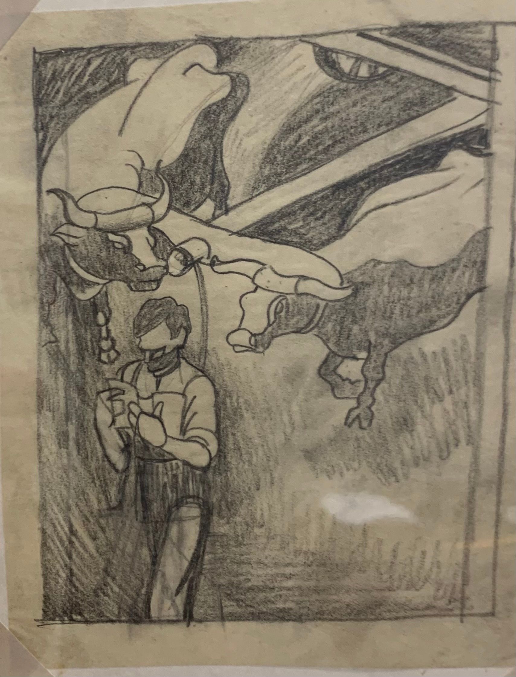 Preliminary and composite sketch for "Biography of Abraham Lincoln in Woodcuts". Abe A young man reads book while leading a pair of oxen pulling a cart. Printed in the United States at Chicago 1933 during 'A Century of Progress Exposition'"Collection