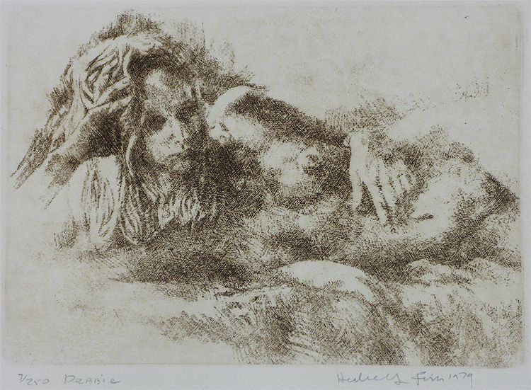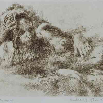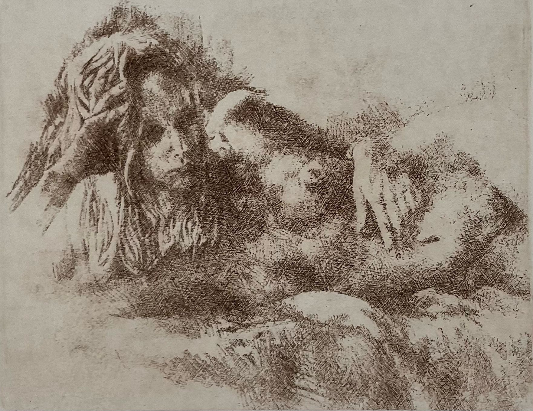 Reclining nude on a bed looking at viewer out of picture. Lolita? The image emerges with crosshatch marks in brown ink.Collection