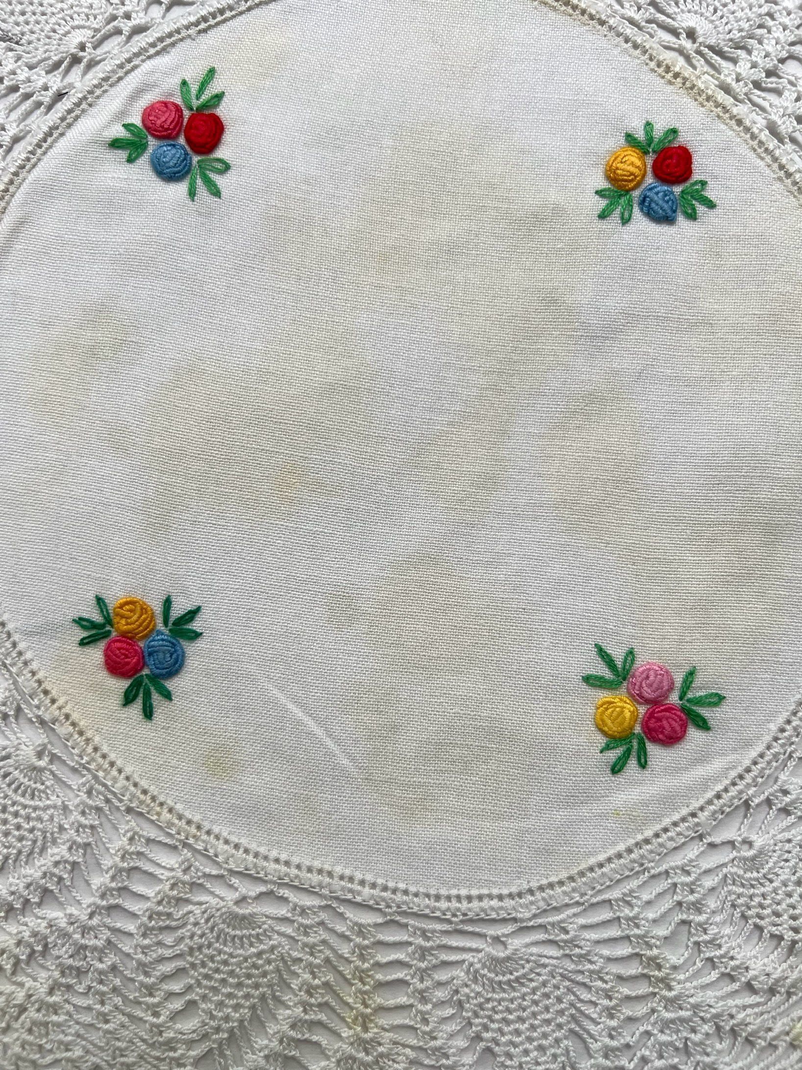 Doily- linen center- crocheted cotton edge (pineapple pattern)- embroidered flowers (red-blue-gold-pink) & leaves (green). "Being personal" in making crocheted doily- by adding colored embroidery in center. Part of set- see also #1976.31.6Collection