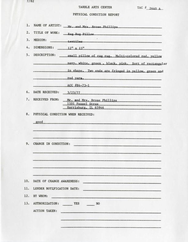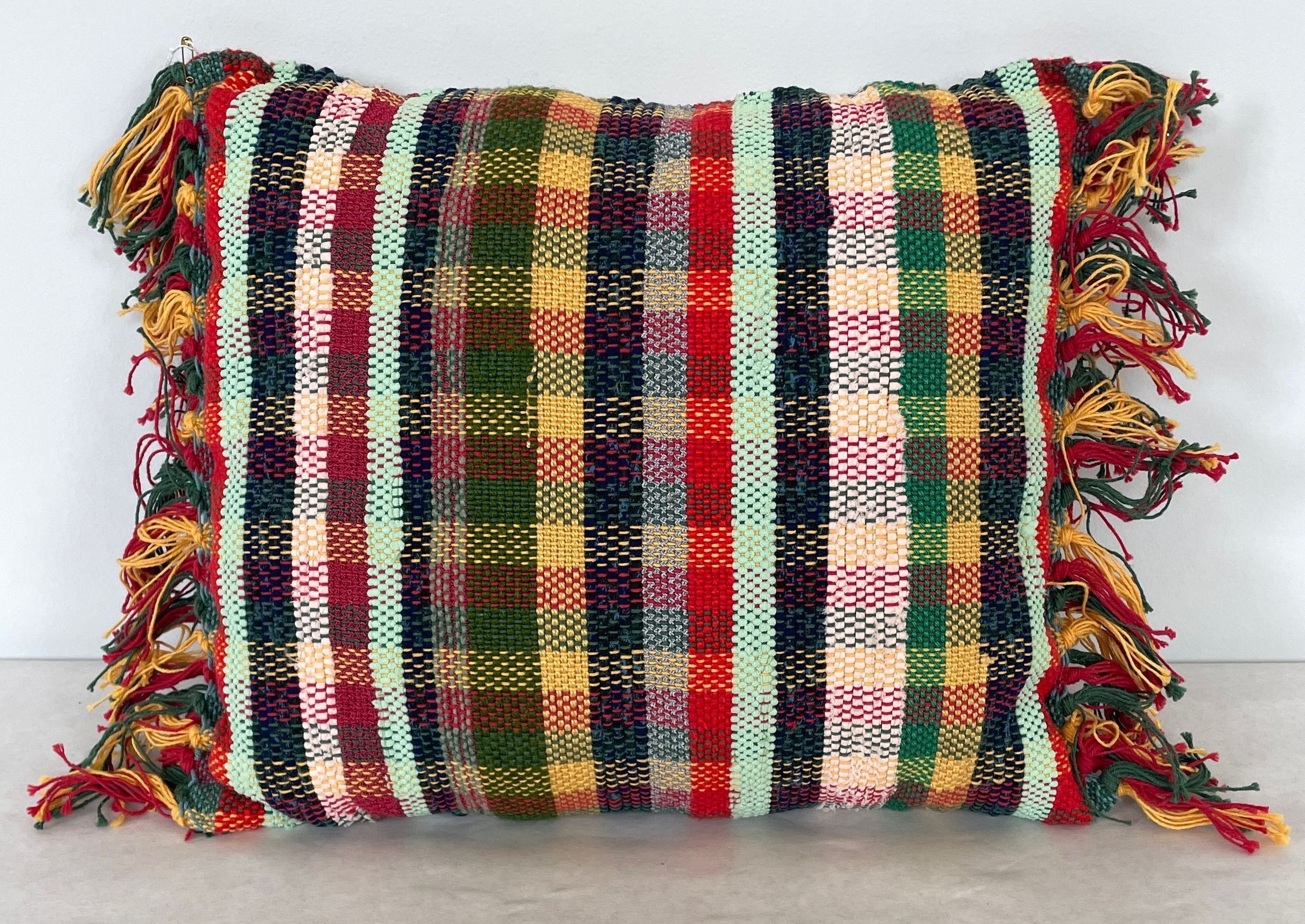Small pillow of rag rug. Multicolored red, yellow, navy, white, green, black, pink. Rectangular in shape. Two ends are fringed in yellow green and red yarn.Collection