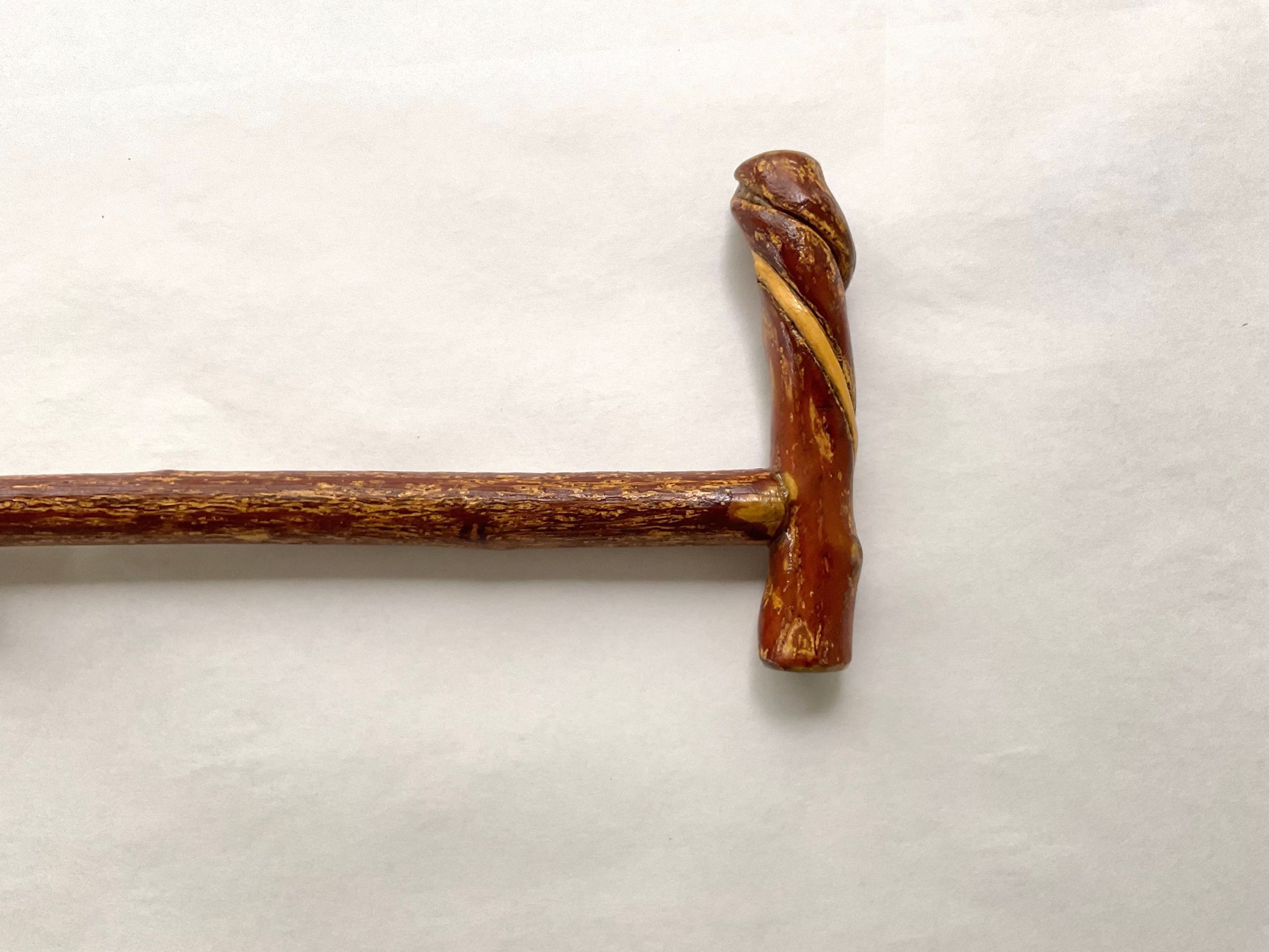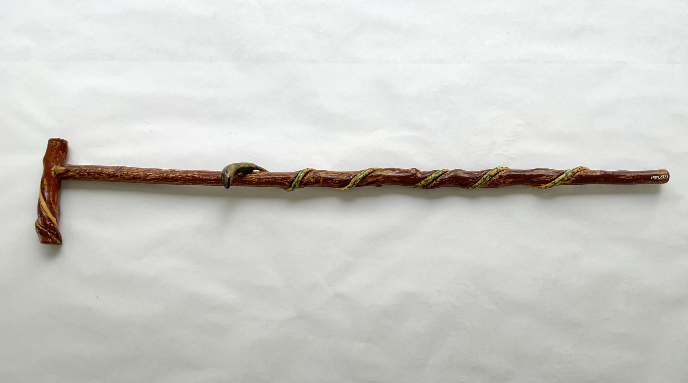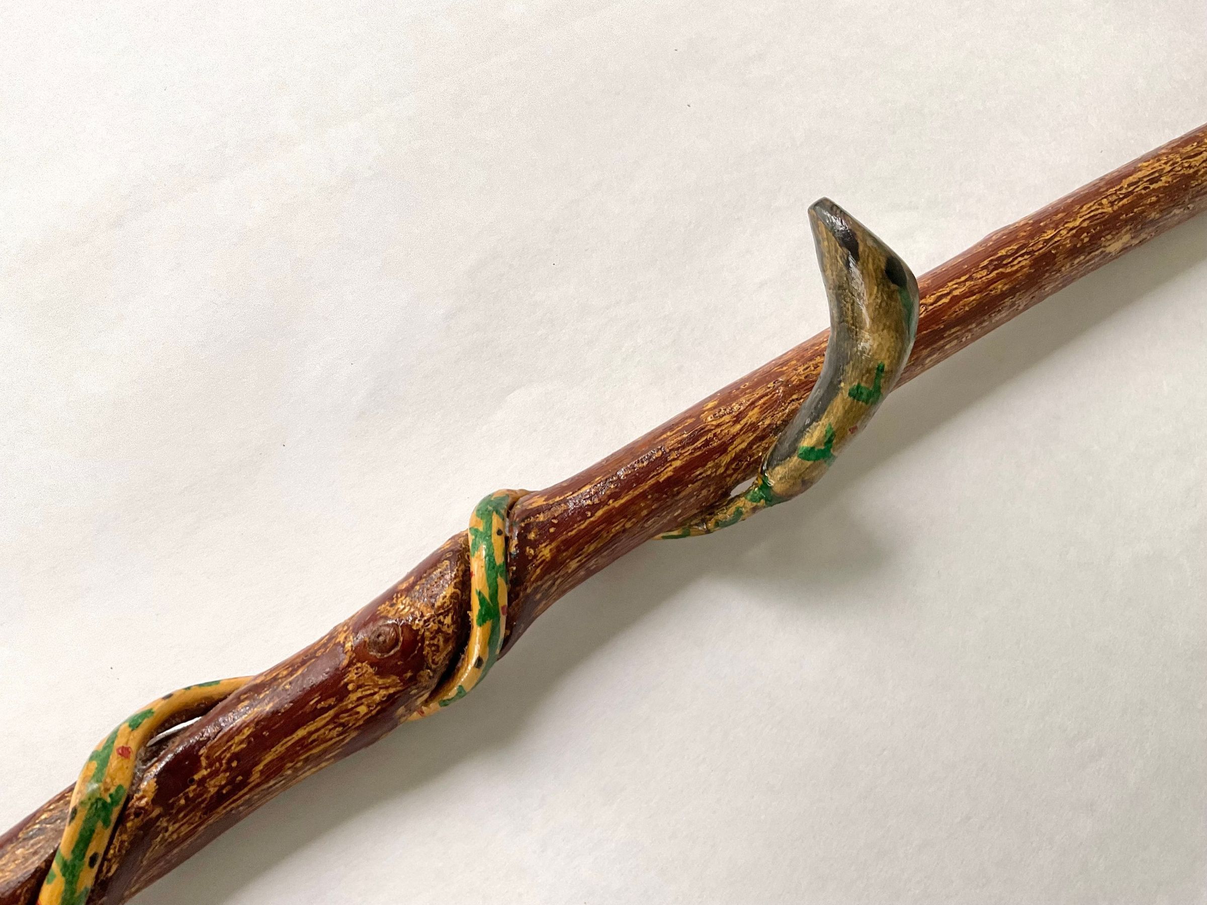 Carved walking stick, brown colored, has painted snake twisting the length of cane, handle at the top with decorative carving, varnished.Collection