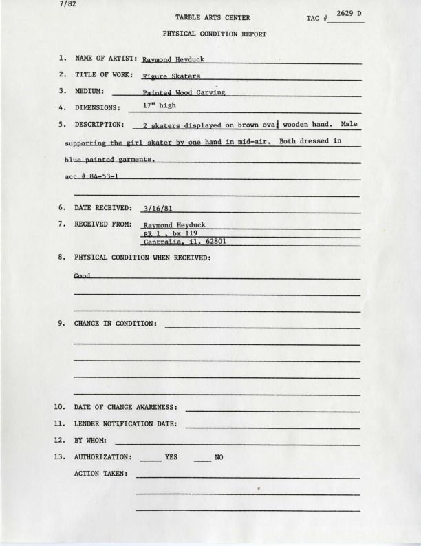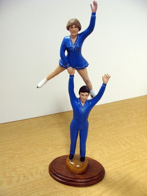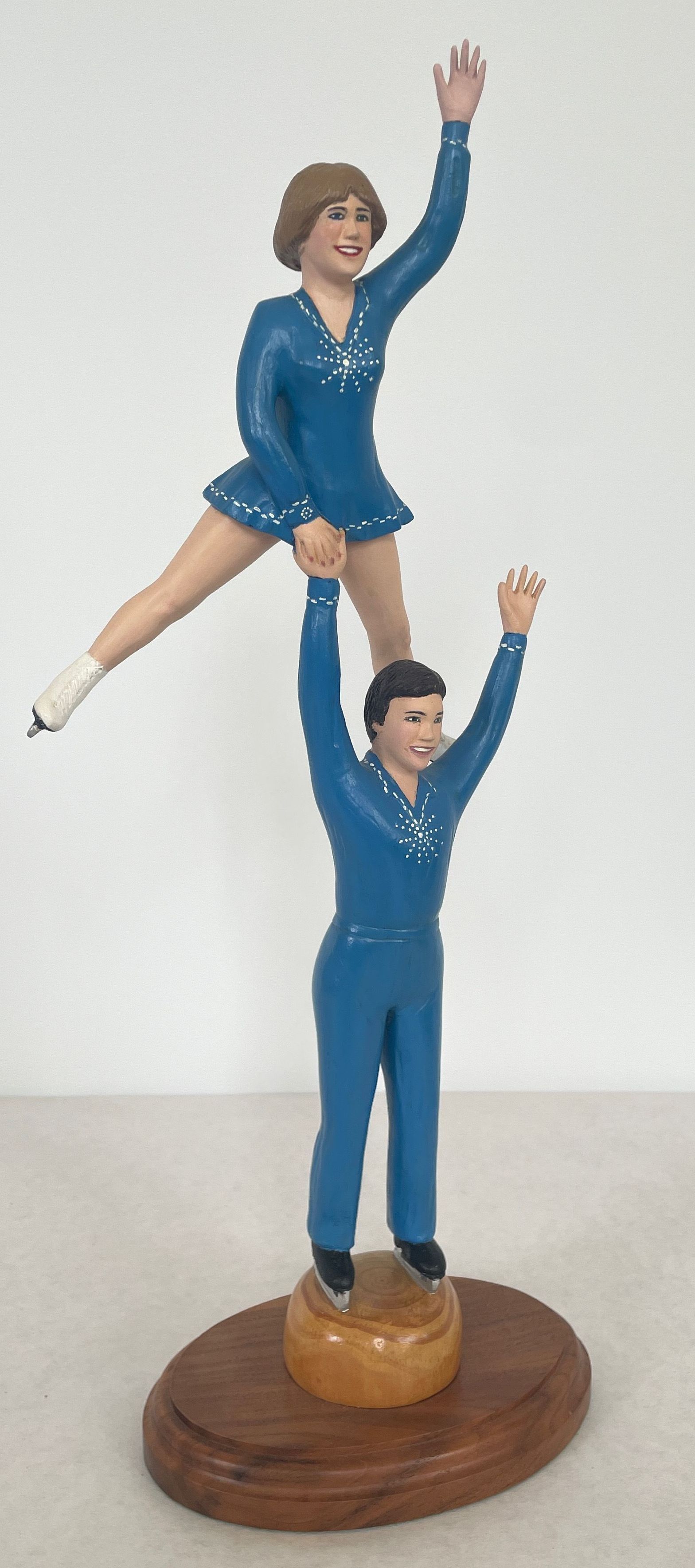2 skaters displayed on brown oval wooden hand. Male supporting the girl skater by one hand in mid-air. Both dressed in blue painted garments.Artwork Details