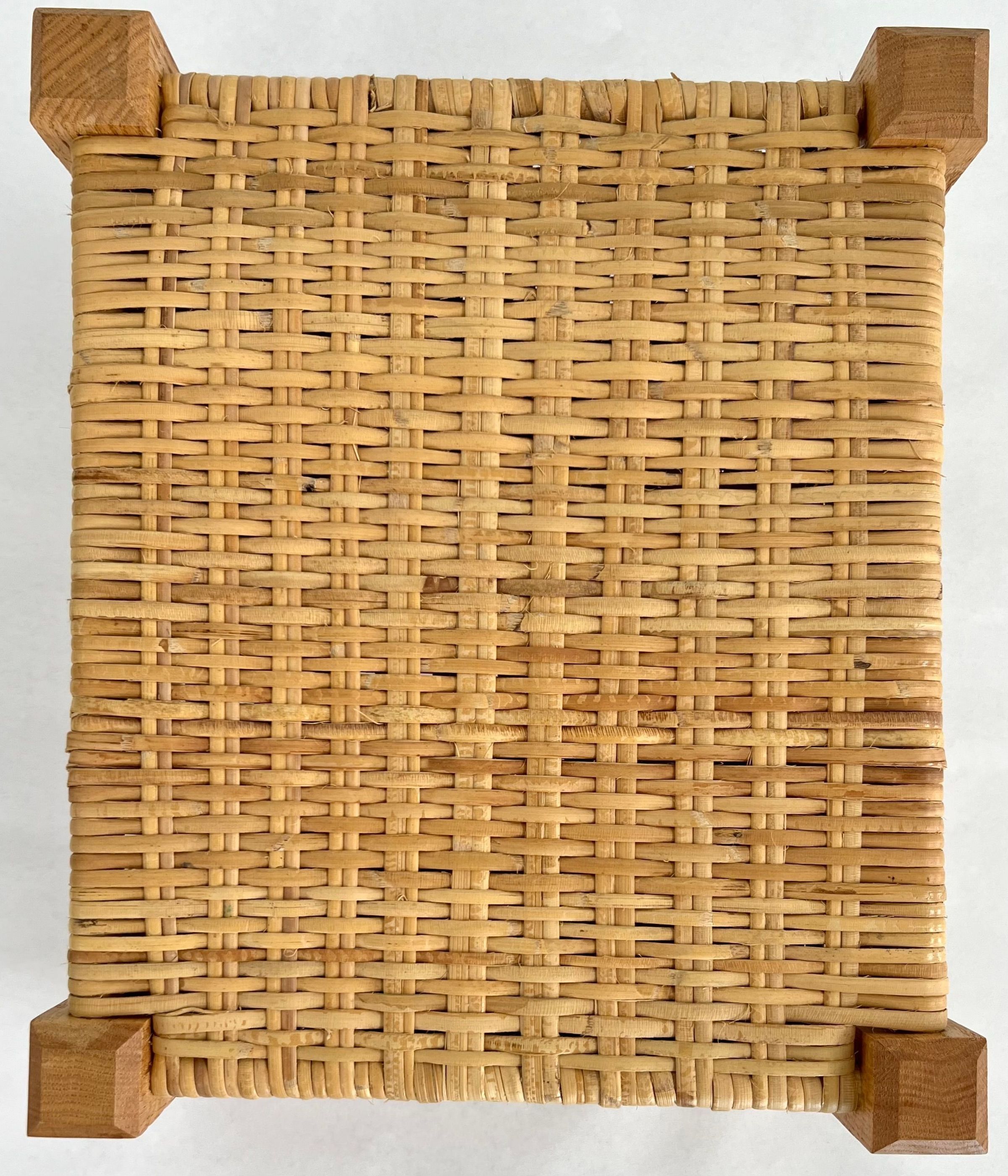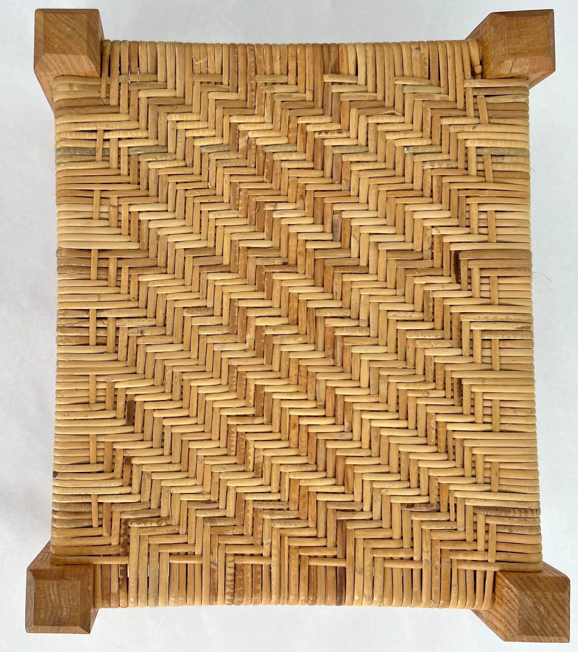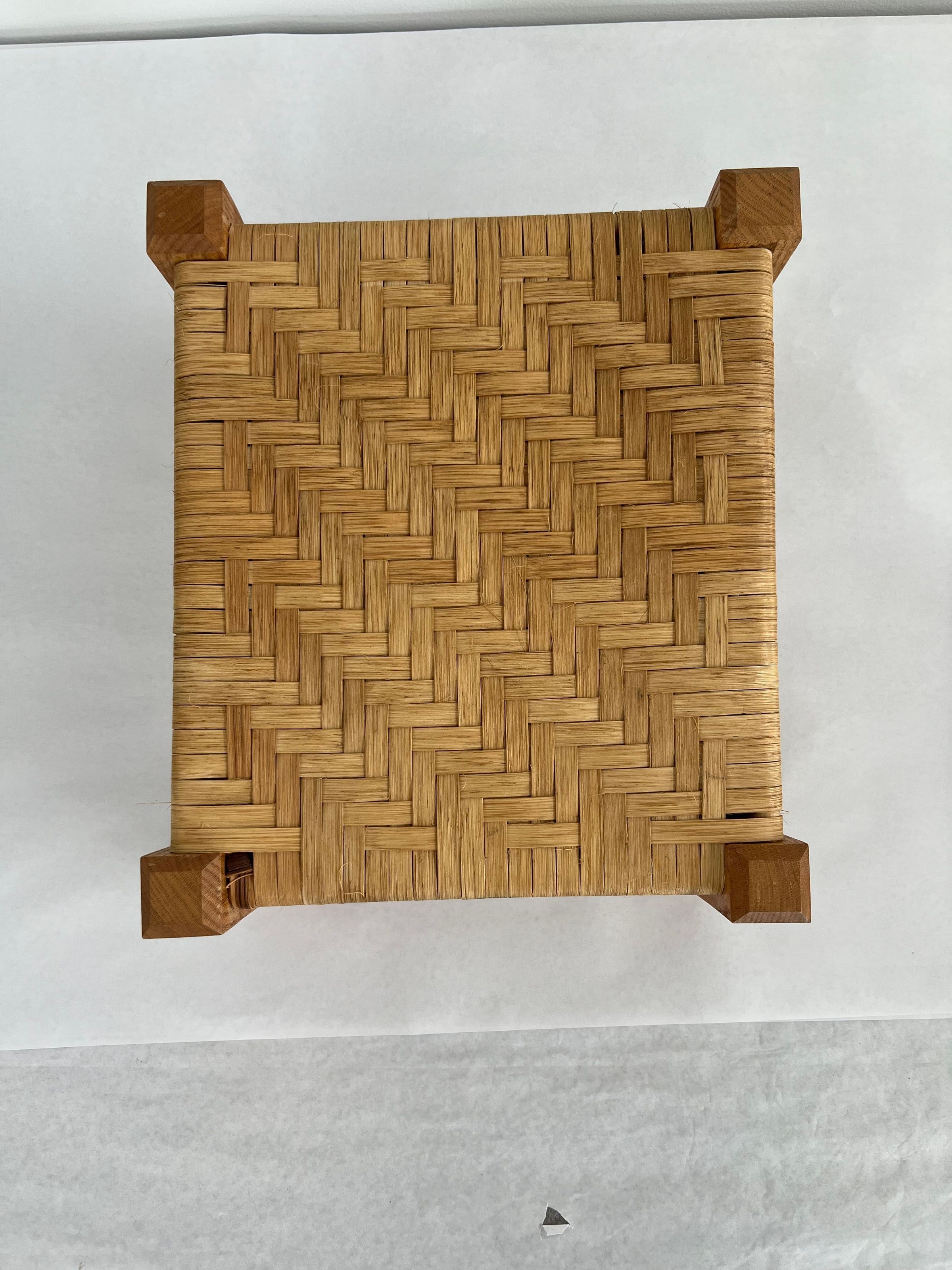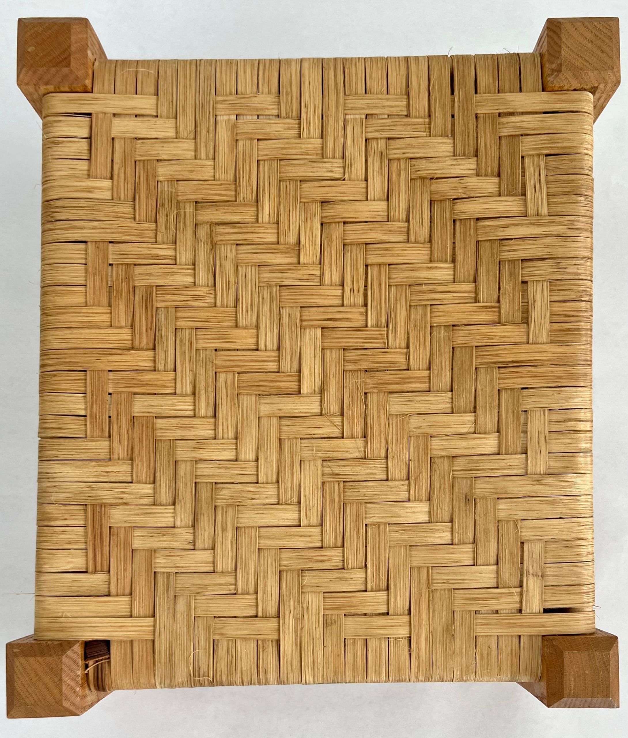 5 caned stools all using split oak & woven seats. Uses herringbone weave, seawood, & over-under weave. All are light brown in color and set close to the ground.Collection