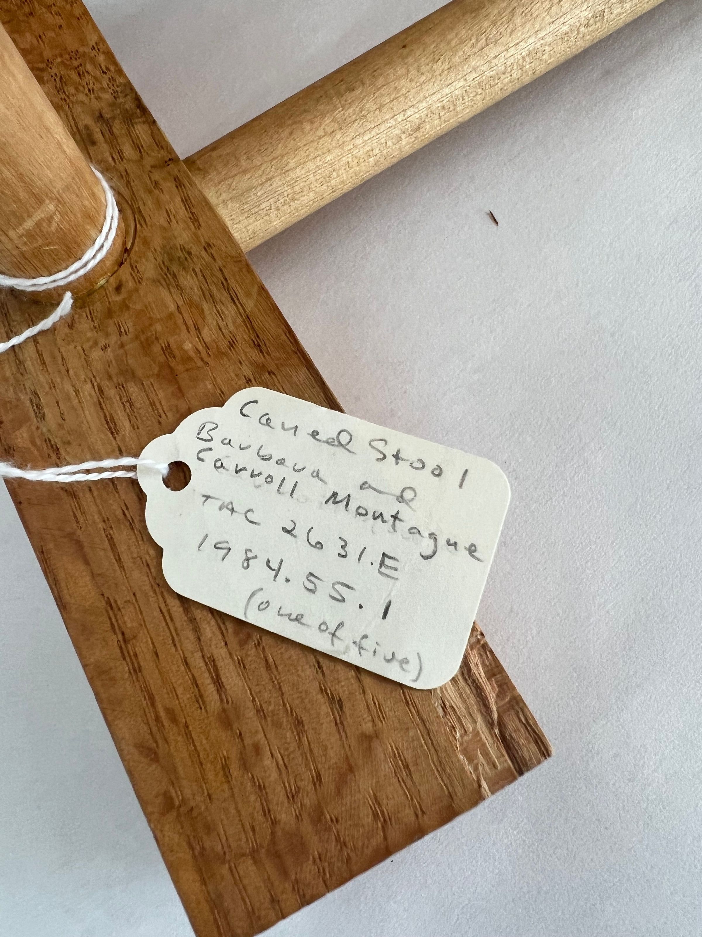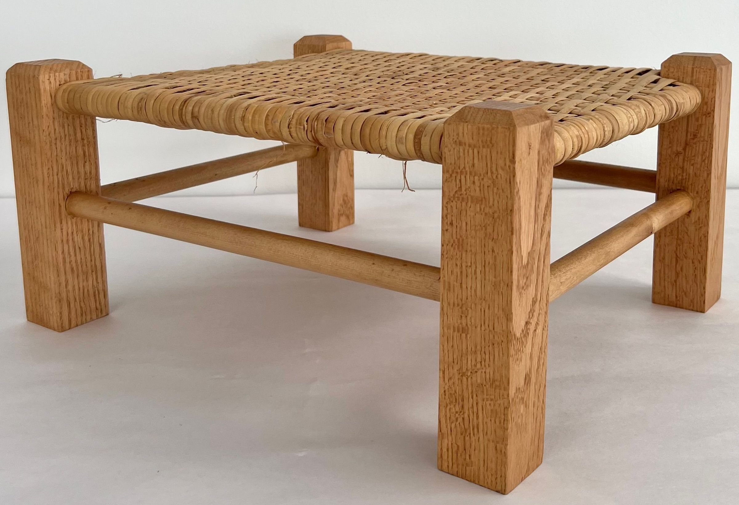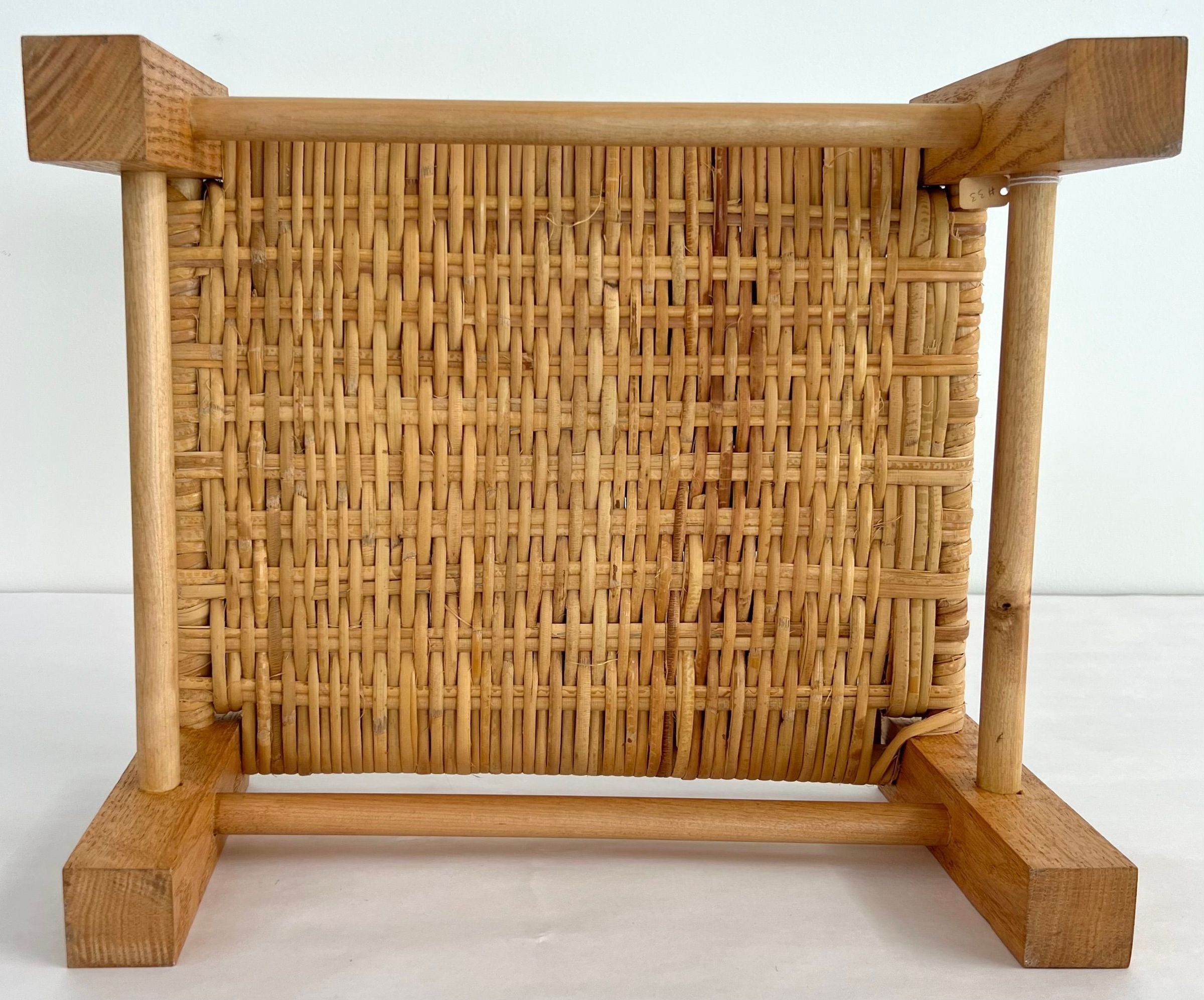 5 caned stools all using split oak & woven seats. Uses herringbone weave, seawood, & over-under weave. All are light brown in color and set close to the ground.Collection