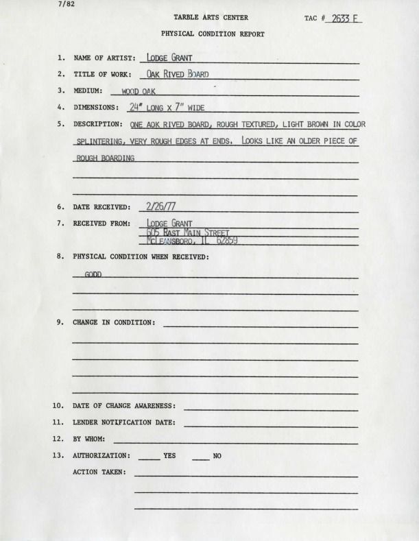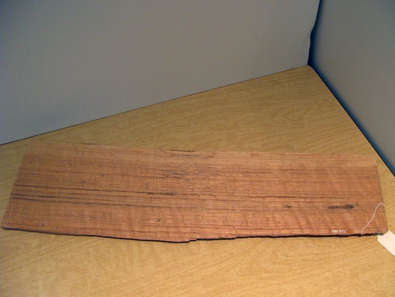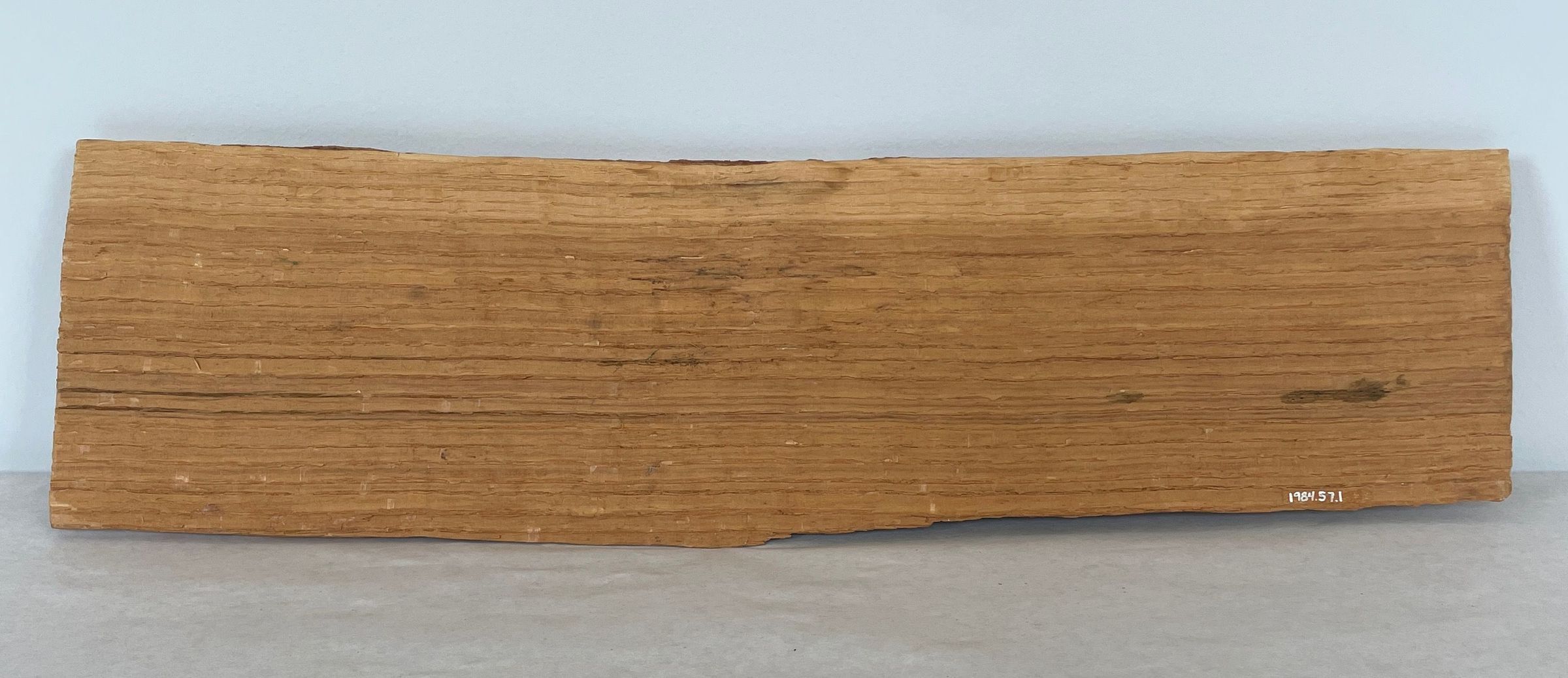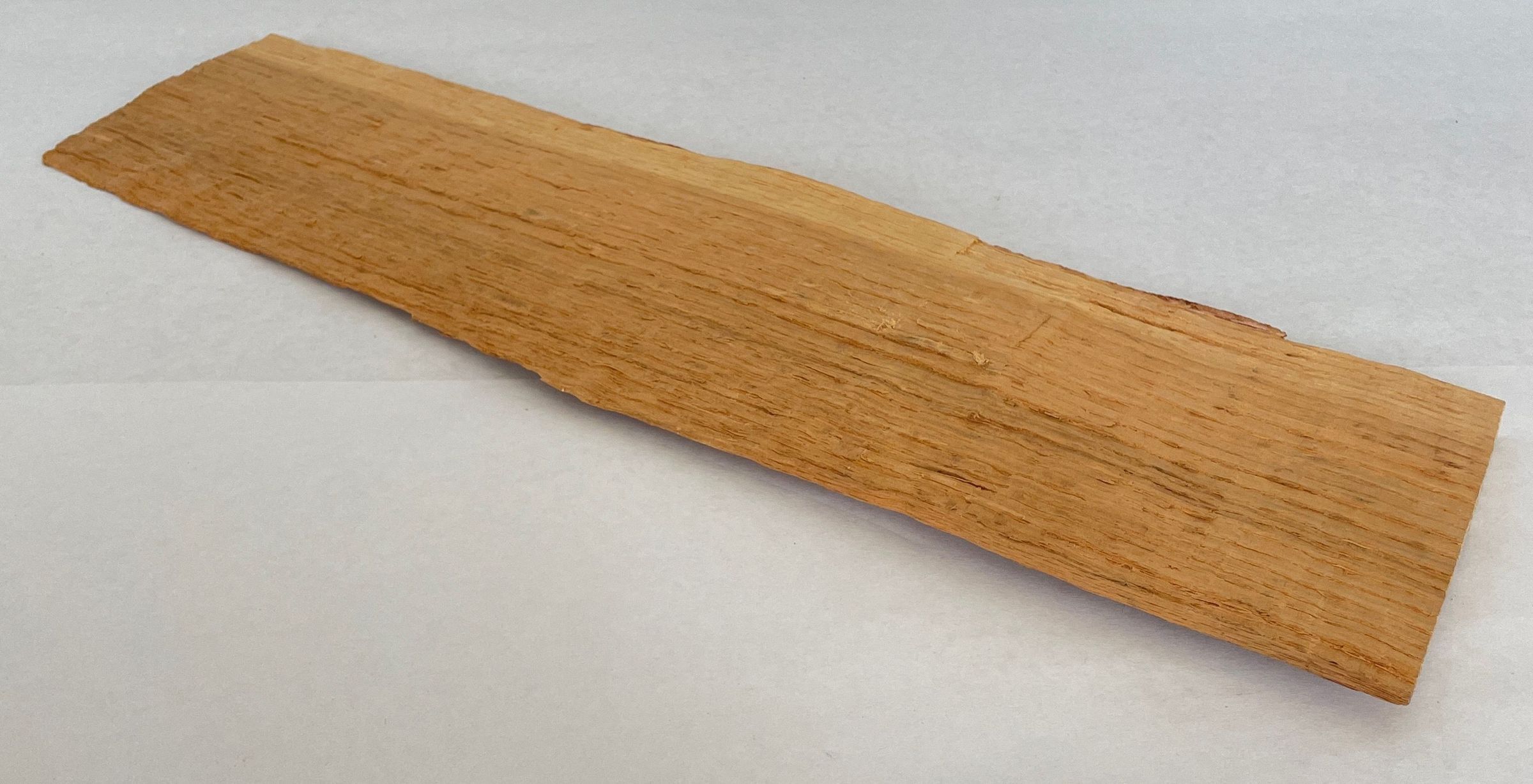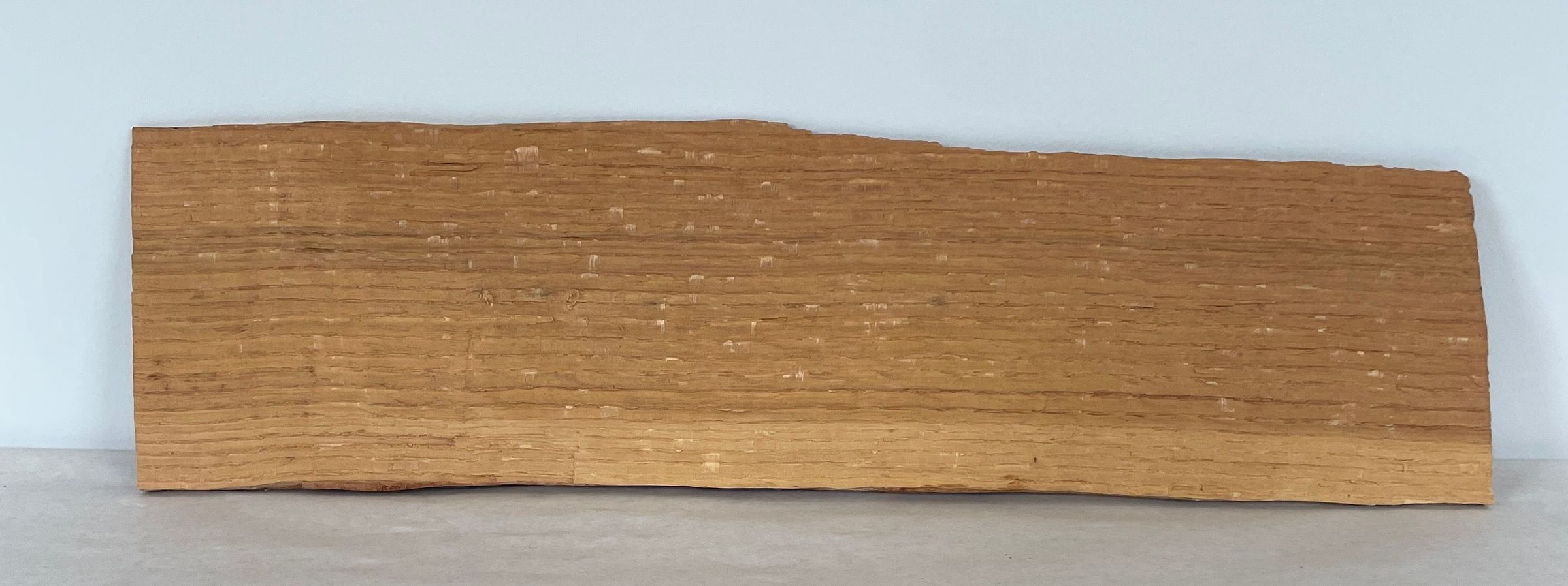 One oak rived board, rough textured, light brown color splintering, rough edges at ends. Looks like an older piece of rough boarding.Collection