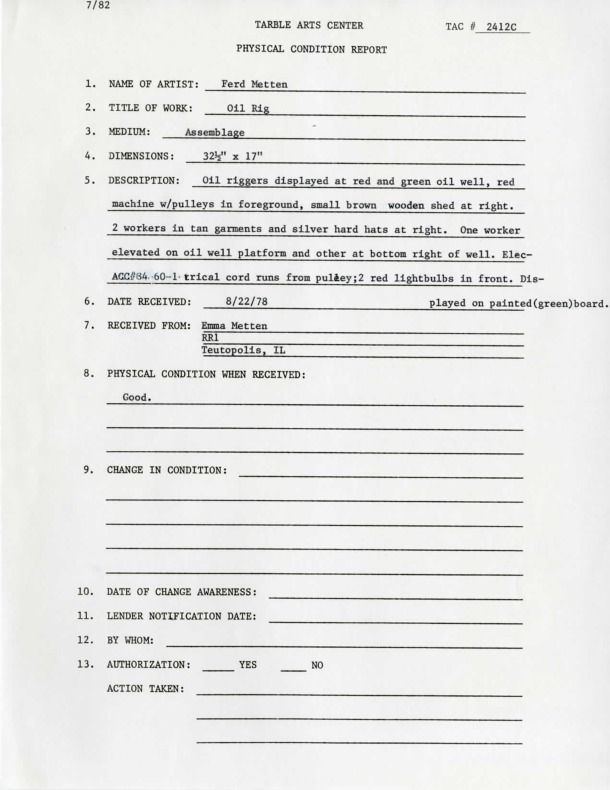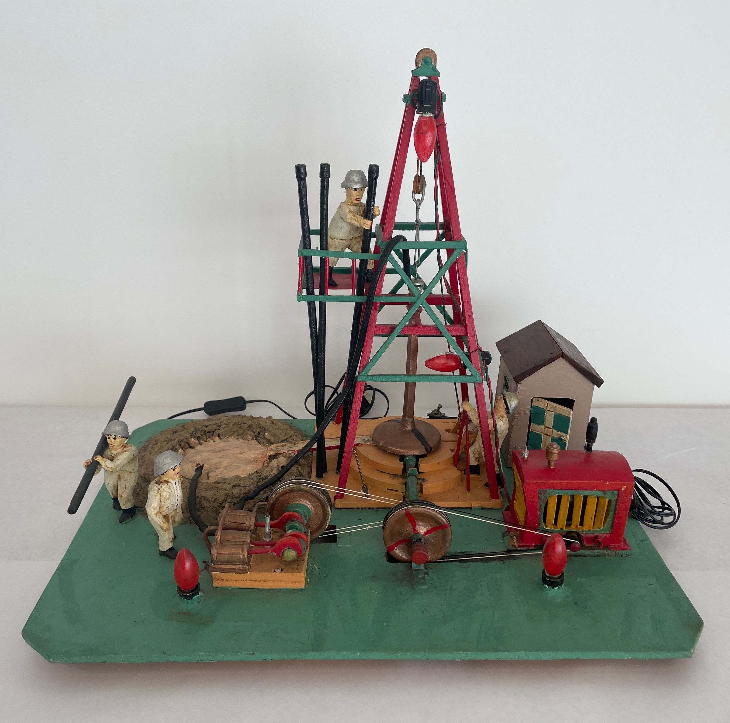 Oil riggers displayed at red and green oil wells, red machine w/pulleys in foreground, small brown wooden shed at right. One worker elevated on oil well platform and other at bottom right of well. 2 workers in tin garments w/silver hard hats. Electrical cord runs from pulley; 2 red light-bulbs in front. Displayed on painted (green) board.Collection
