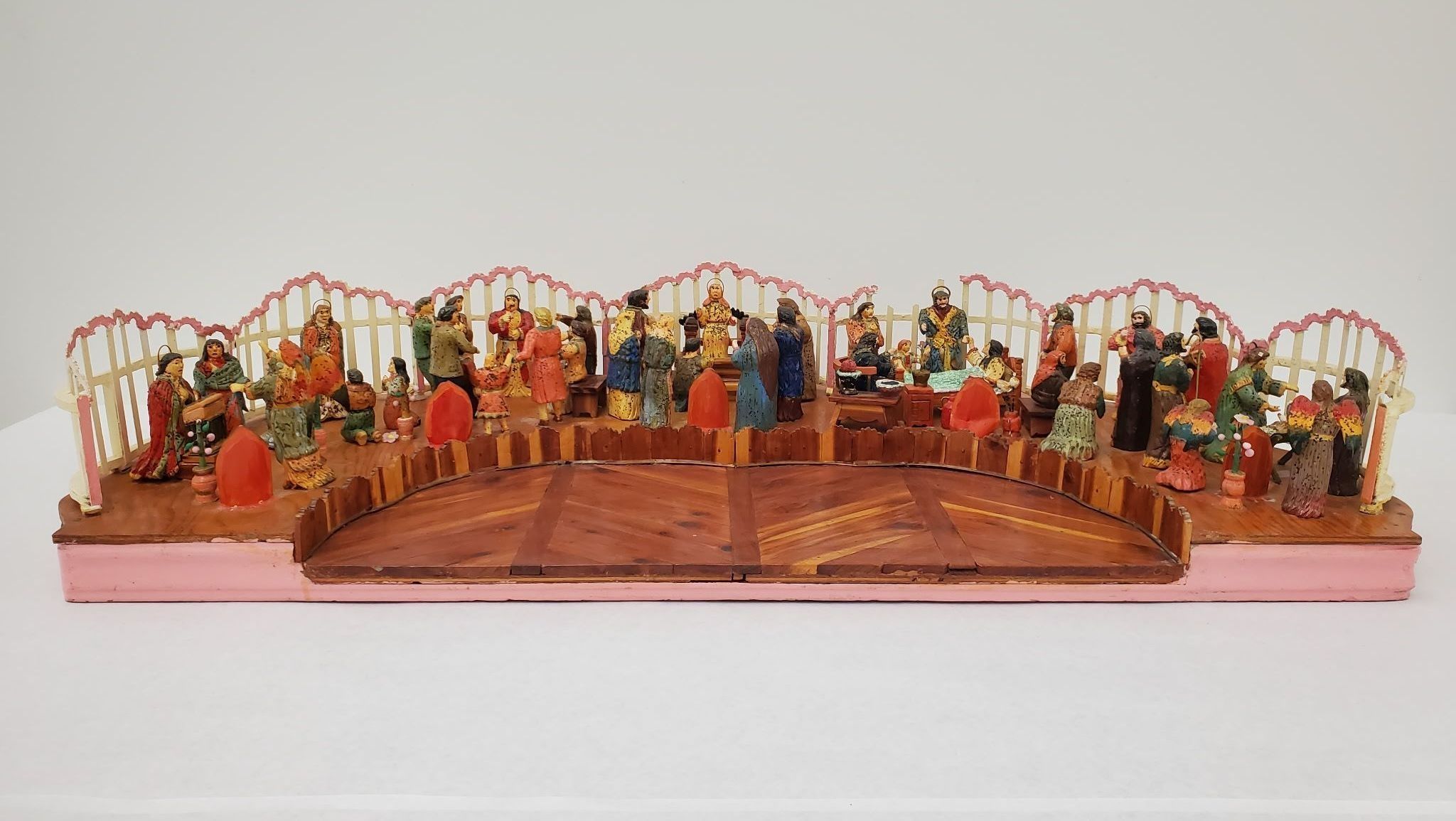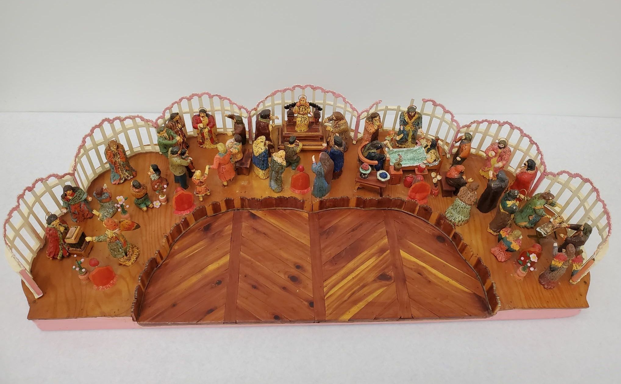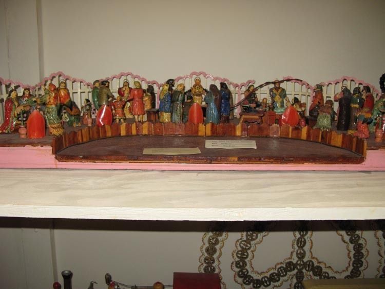 Materials: Mixed Media. An assembled diorama of seven individual scenes in a semi circle display. Angels, worshipers, a bedridden woman, a baby, preachers and Christmas tree light bulbs make up the various scenes in the display. Electrical cord Attached.Collection