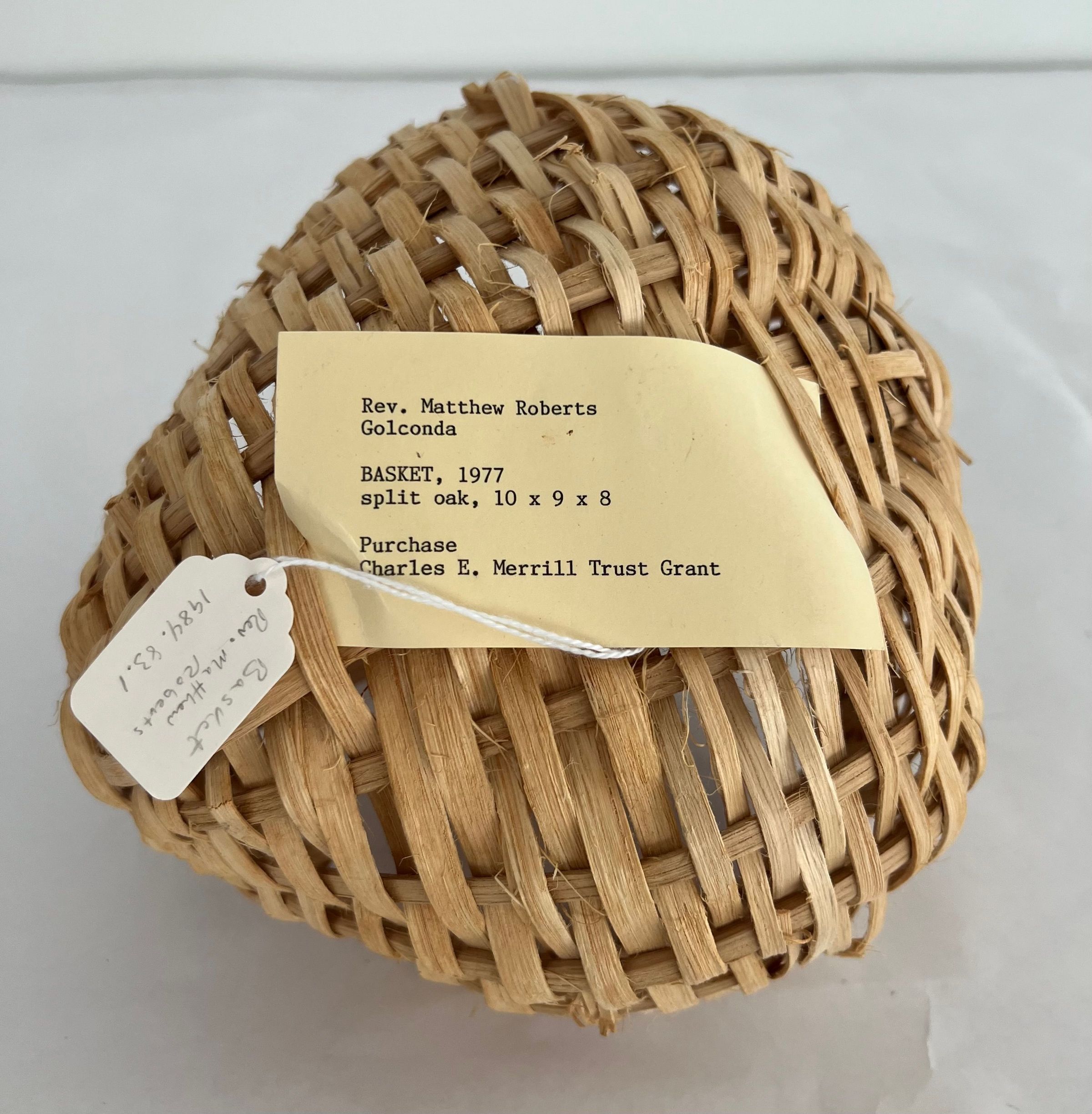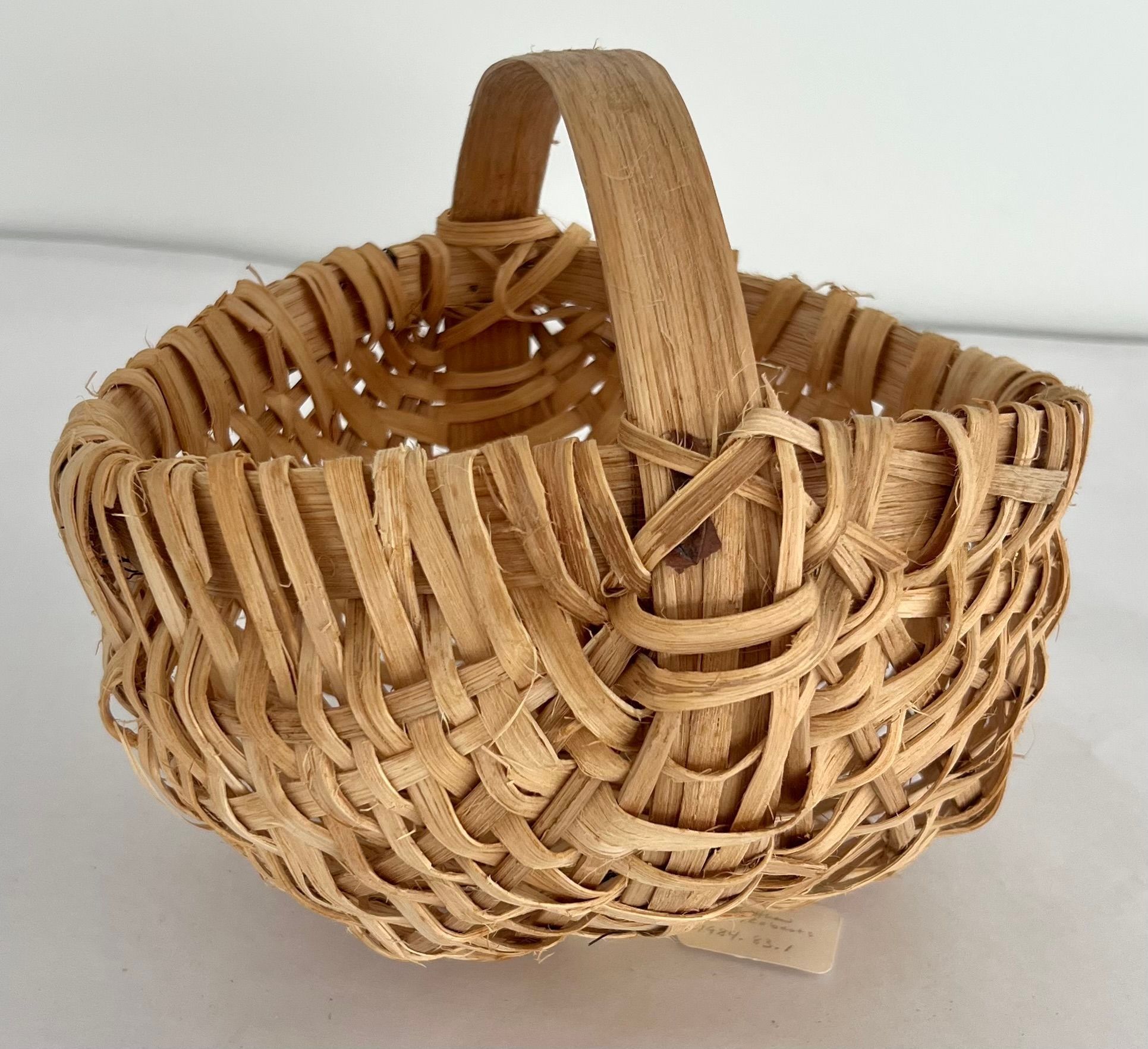 Small round shape with basket made of split oak. Has low handle on it. Light tan color.Collection