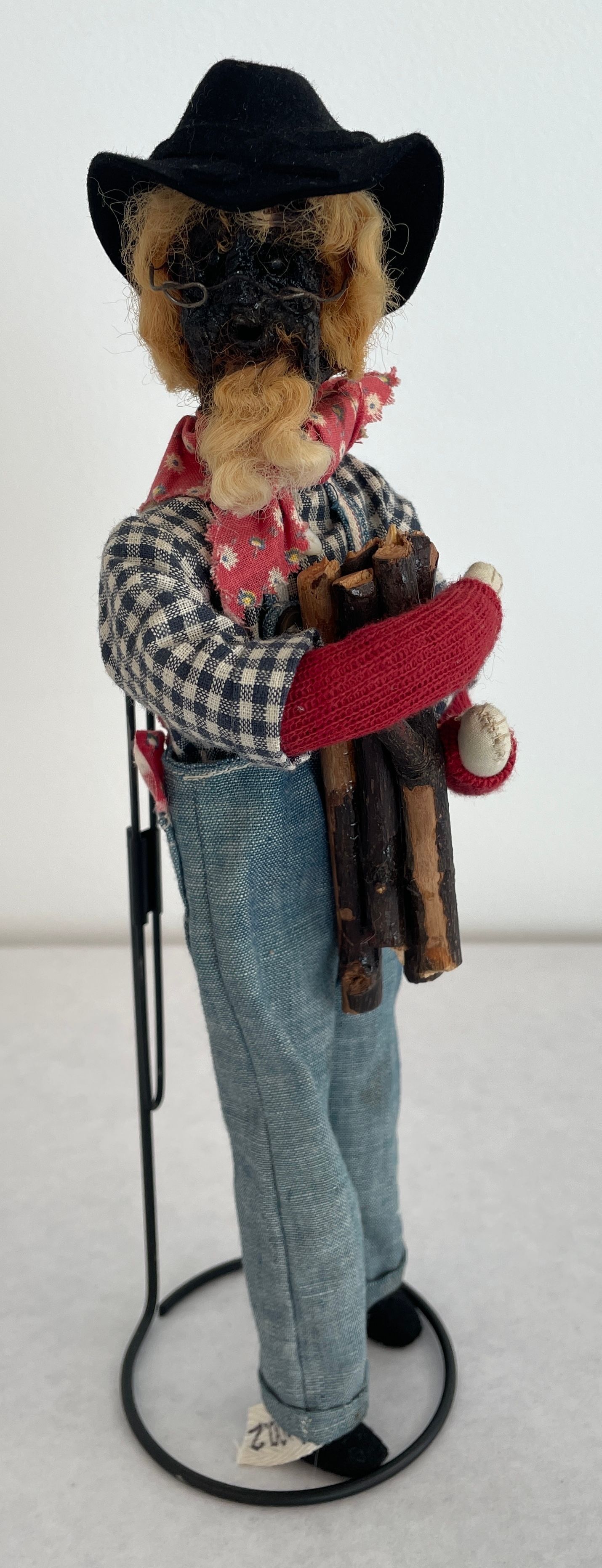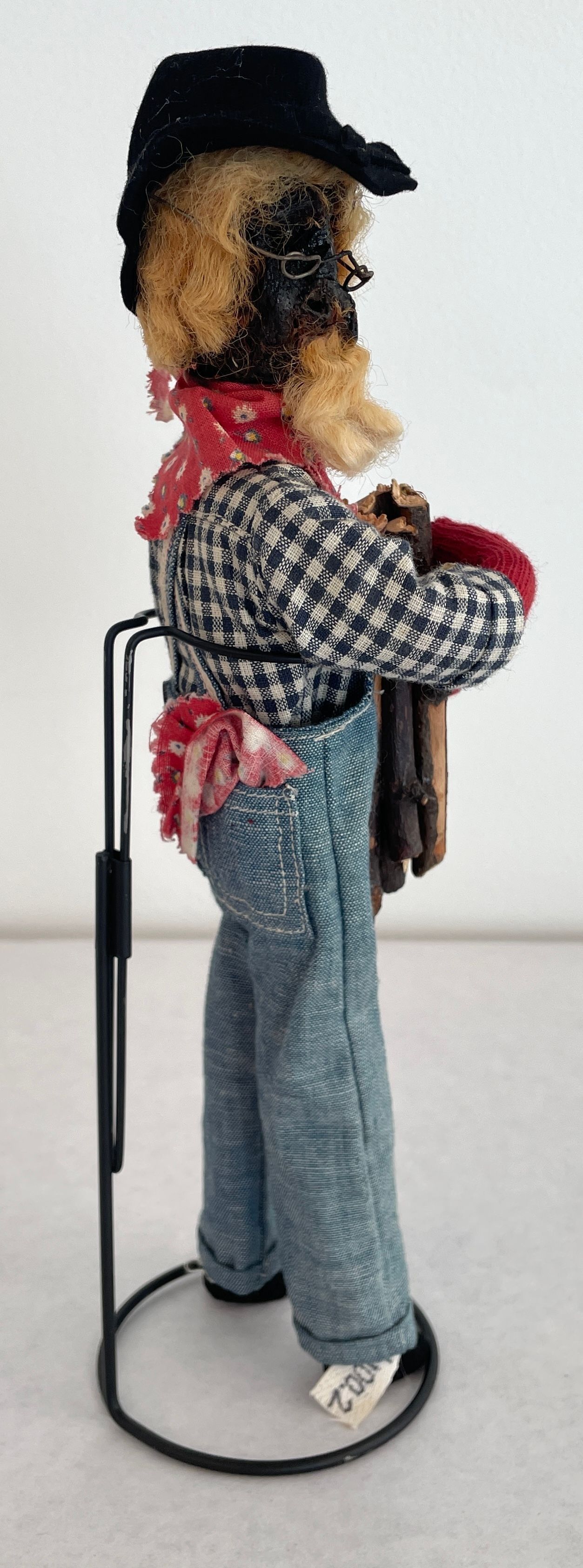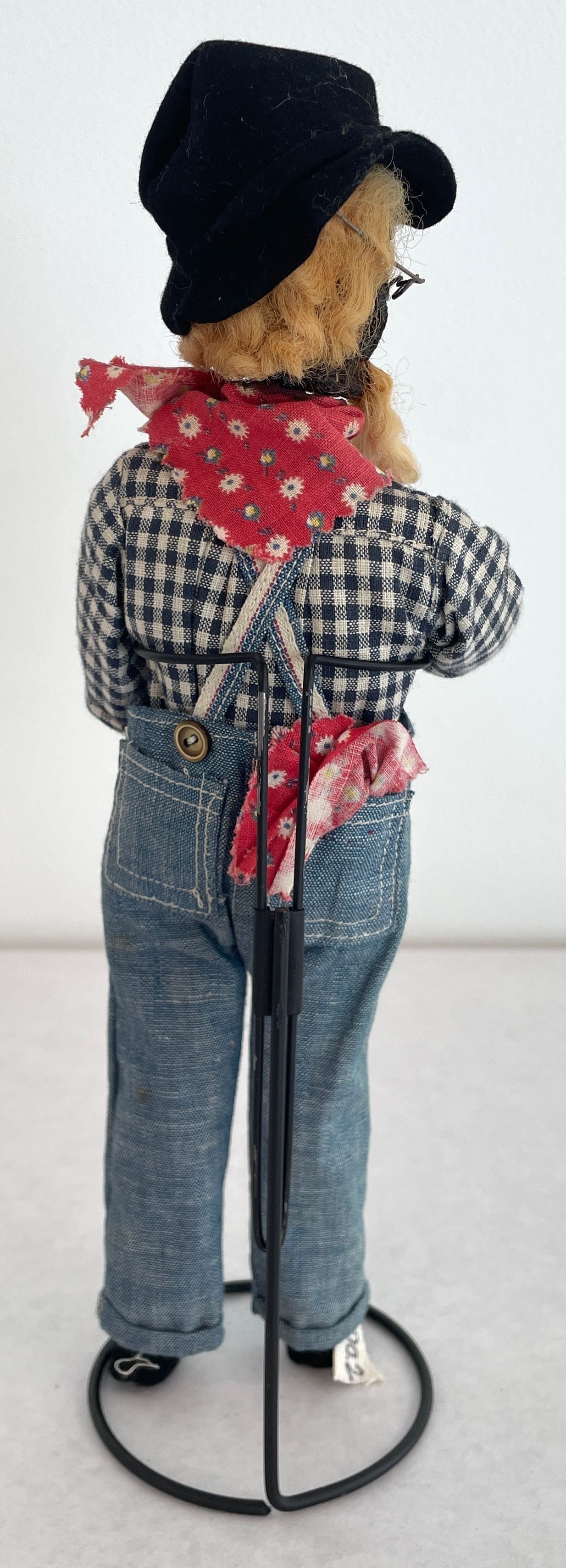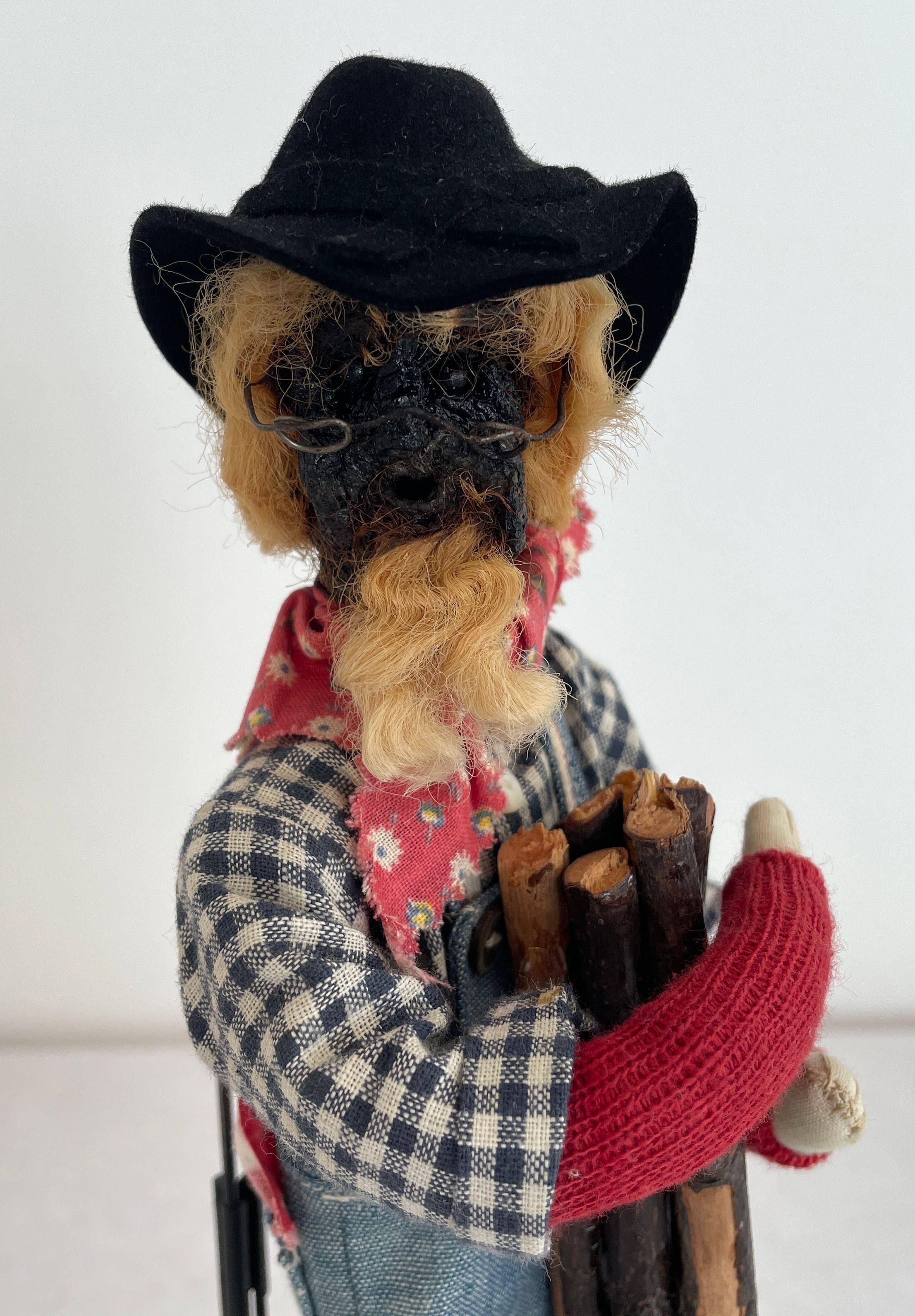 Farmer doll: head is a stained brown shrunken apple with a beard black bead eyes wire glasses and blonde yarn hair with a black hat, spectacles, red bandana, blue jean overalls and a blue and white checkered shirt.